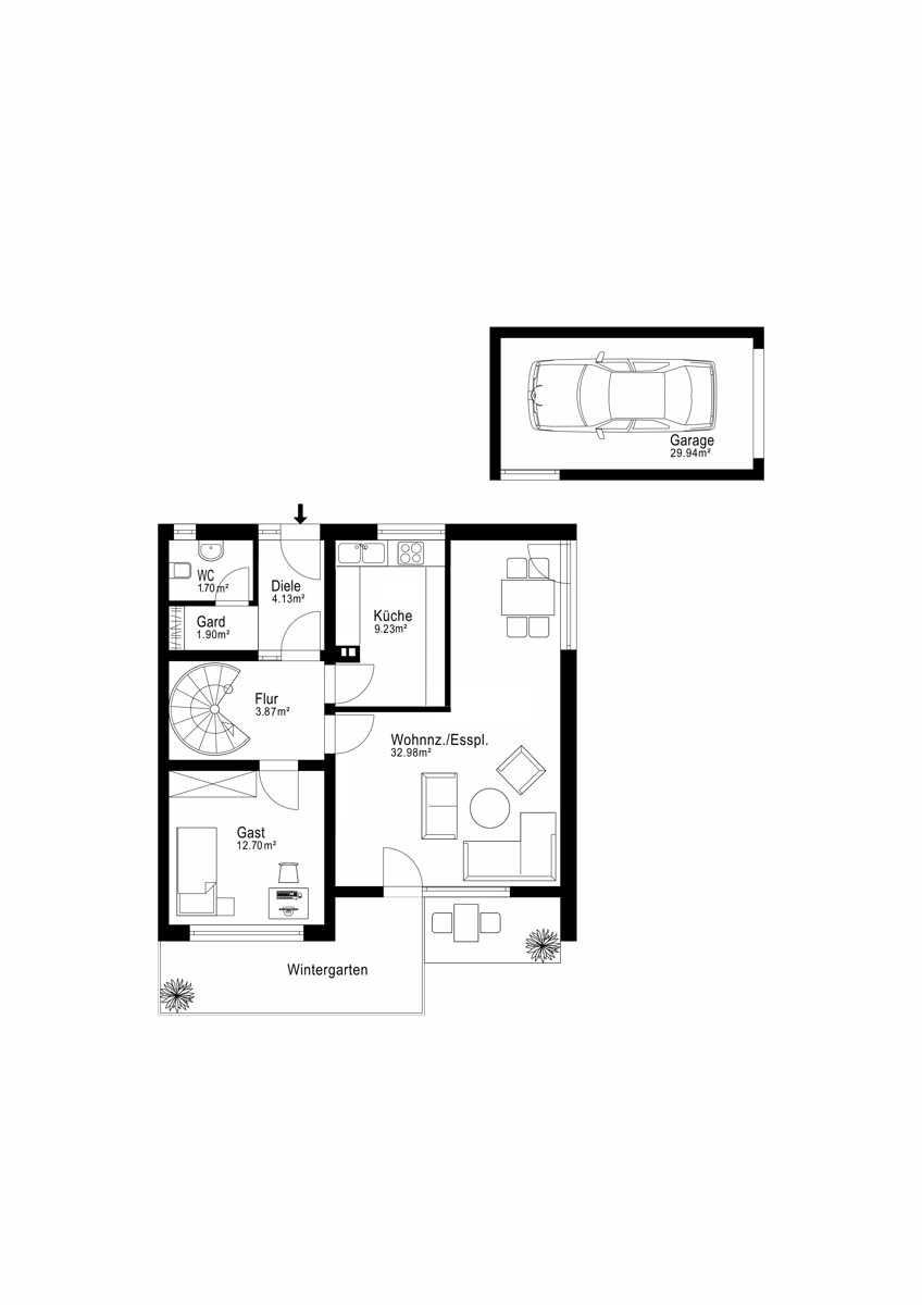 Im Erdgeschoss finden Sie ein helles geräumiges Wohnzimmer mit angrenzendem Essbereich, eine separate Küche, ein Gäste-WC, eine Garderobe, eine Diele und ein Gästezimmer. Durch das Entfernen einer geplanten Zwischenwand kann hier ein offener Küchen- und Essbereich entstehen. Die großen Fenster im Wohnzimmer führen zur westlich ausgerichteten Terrasse und dem Garten und sorgen für einen beruhigenden Ausblick. Ein besonderes Highlight stellt der etwa 16 m² große Wintergarten dar, der auch bei ungemütlichem Wetter einen ungestörten Blick ins Grüne ermöglicht.