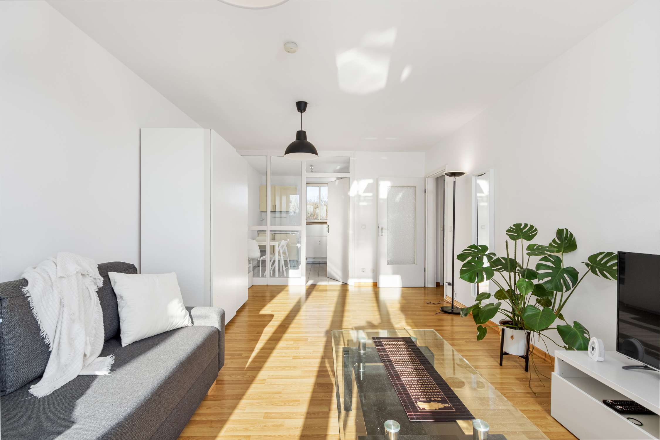 Der einladende Wohnraum erstreckt sich nach Süden zum großen Balkon mit Blick auf die weitläufige Grünanlage zum Innenhof hin. Die rund 8m² große Küche beinhaltet nicht nur eine kleine Einbauküche mit einfacher Grundausstattung, sondern auch Platz für einen kleinen Essbereich. So bleibt im Wohnbereich ausreichend Platz für eine gemütliche Schlafcouch und - bei Bedarf - ein Homeoffice-Bereich. Die räumliche Trennung lässt dank Glaselementen viel Licht in den gesamten Raum.