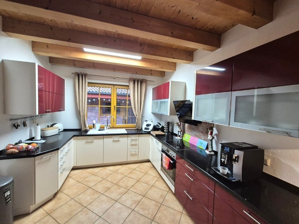Im Erdgeschoss befindet sich die moderne Einbauküche mit hochwertigen Geräten, Franke-Spülbecken, schwarzen Arbeitsflächen mit feinem Glitzereffekt und mediterranen Fliesen. Sichtbare Echtholzbalken und ein kleiner Essbereich schaffen eine besonders gemütliche Atmosphäre. Ein großzügiger Hauswirtschaftsraum mit Gartenzugang bietet zusätzlichen Stauraum und vielfältige Nutzungsmöglichkeiten – etwa als Vorraum oder Hobbyfläche. Das Gäste-WC verfügt über ein Fenster und ein ansprechendes zweifarbiges Fliesendesign.