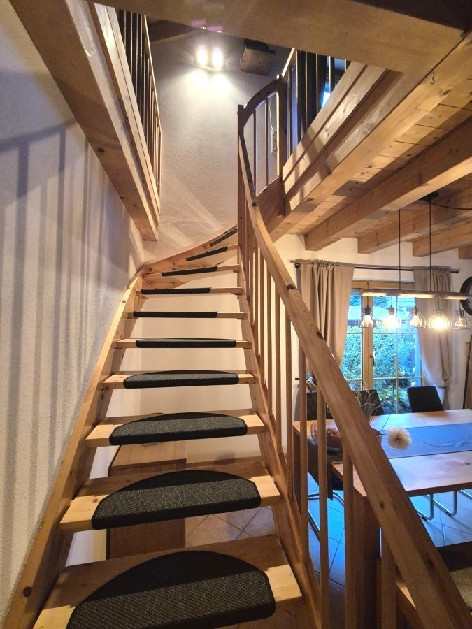Über eine offene Treppe gelangt man in die obere Etage im Galeriestil, die mit einem großen, lichtdurchfluteten Wohnraum beeindruckt. Offene Deckenbalken, angenehme Raumhöhe und geschickt genutzte Stauräume unter der Schräge verleihen dem Raum ein großzügiges und zugleich wohnliches Flair – ideal nutzbar als kombinierter Wohn- und Arbeitsbereich.