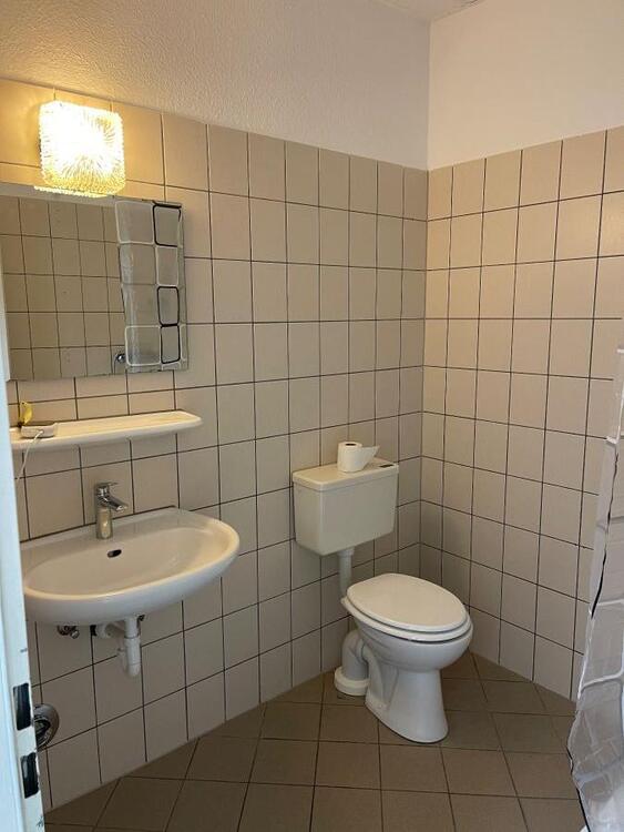 Das Appartement besteht aus einem kleinen Vorraum mit Zugang zum Wohnraum und zum Bad, bestehend aus Dusche, Waschtisch und WC. Bodenbeläge alle aus Fliesen. Im Bad sind die Wände ebenfalls mit Fliesen bis 2 Meter Höhe belegt.