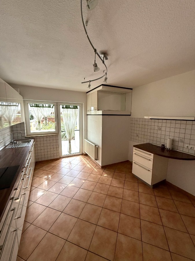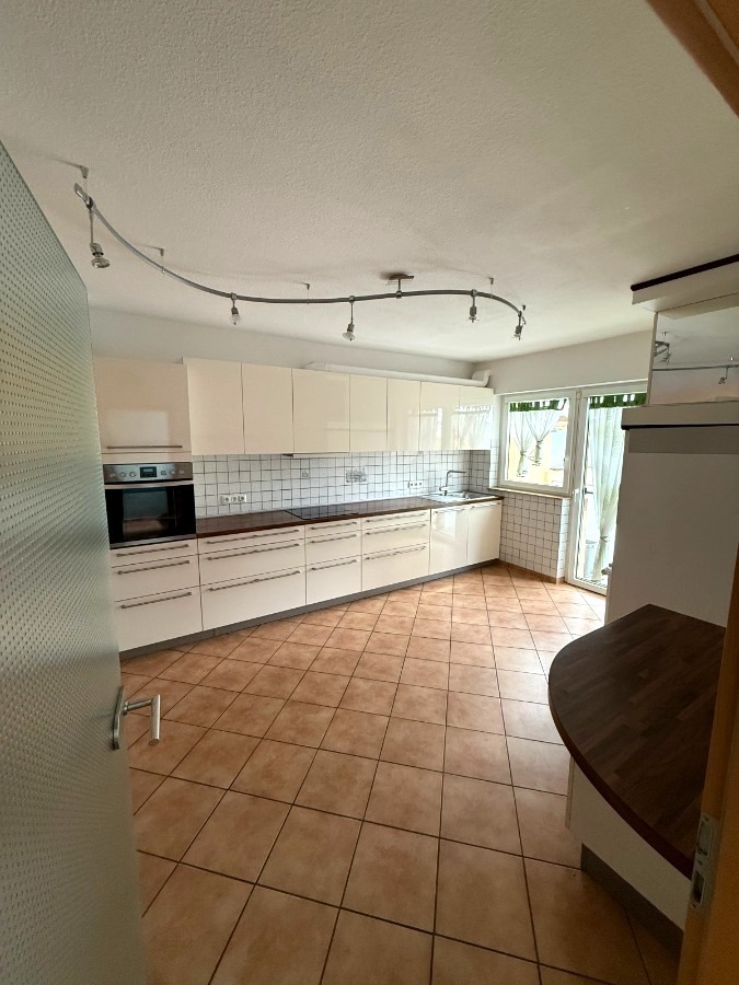 großzügige Küche mit Essbereich und moderner Plana-Einbauküche und Zugang zur überdachten Terrasse