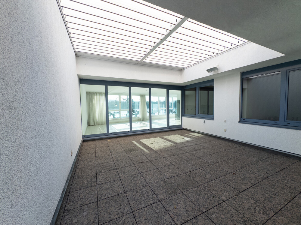 Die zum Rhein ausgerichtete Terrasse ist direkt über den Hauseingang zugänglich und bietet einen exklusiven Platz im Freien, um die Weite des Wassers zu genießen oder den Abend in entspannter Atmosphäre ausklingen zu lassen.