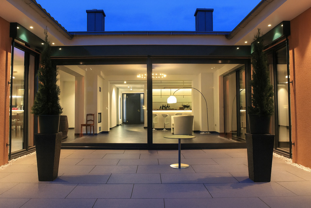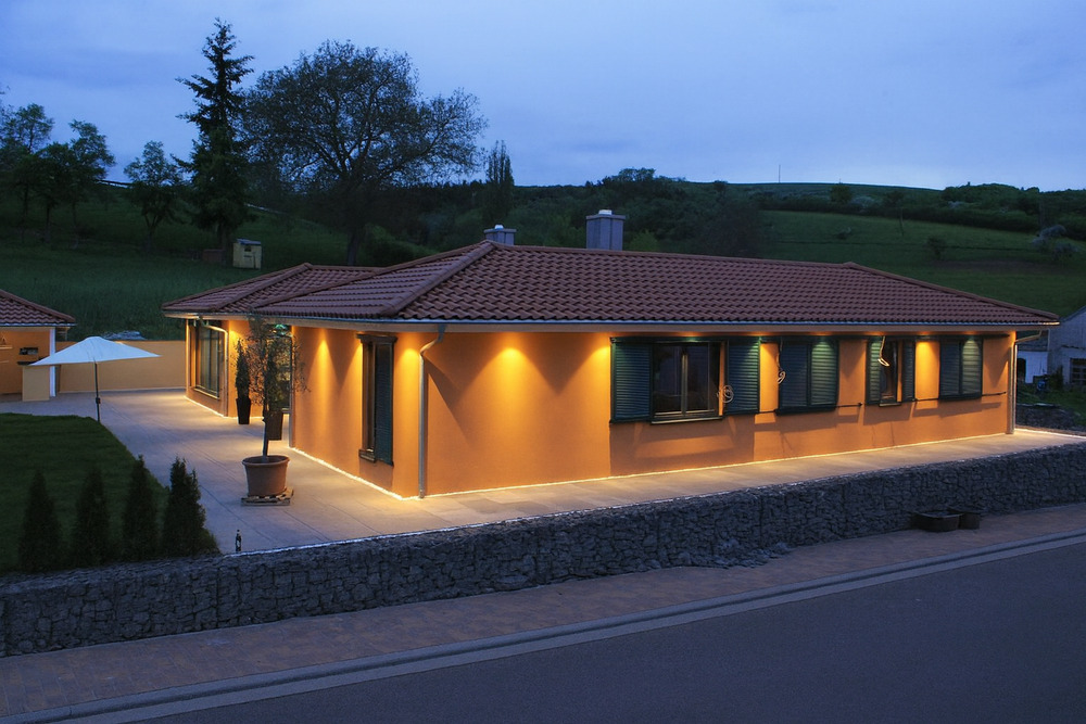 • Außenansicht bei Dämmerung - Wohnen auf einer Ebene! Barrierefreier Bungalow mit exklusiver Ausstattung