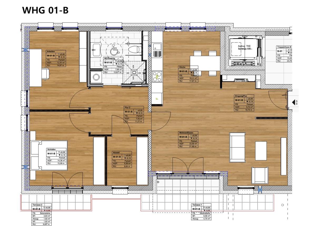 Die Wohnung besteht aus dem hellen Wohn/Essbereich von ca. 38 m² mit integrierter Küche. und Zugang auf die sonnige Terrasse von ca. 9 m². Auf Wunsch kann die Küche offen oder geschlossen gestaltet werden. An den Wohnbereich ist der separate Schlaftrakt angegliedert. Dieser besteht aus dem Elternschlafzimmer von ca. 15 m² mit Ausgang auf die zweite Terrasse von ca.4 dem Abstellraum/Büro/Ankleide von ca. 6 m², einem geräumigen Kinderzimmer/Büro von ca. 13 m² sowie dem behindertengerechten Duschbad mit Fenster von ca. 8 m². Die gesamte Wohnfläche beträgt ca. 102 m². Die Wohnung wurde barrierefrei konzipiert.