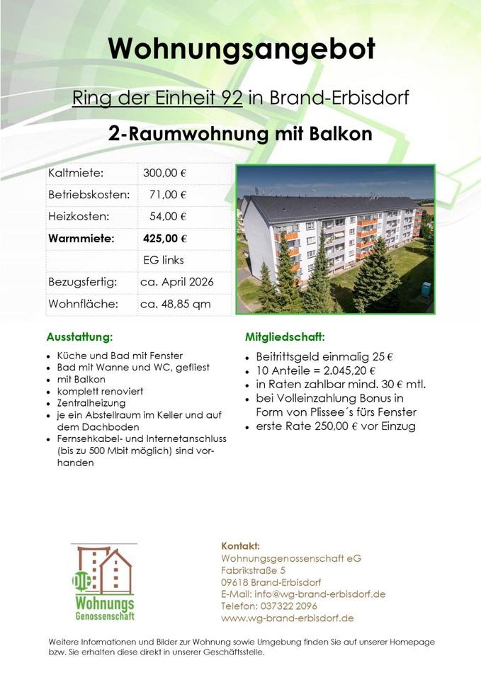 Sie befinden sich hier: Einziehen & Wohlfühlen: schöne 2- Raumwohnung mit Balkon im EG in Brand-Erbisdorf - 3298543695-203-18565 | 1A-Immobilienmarkt.de
