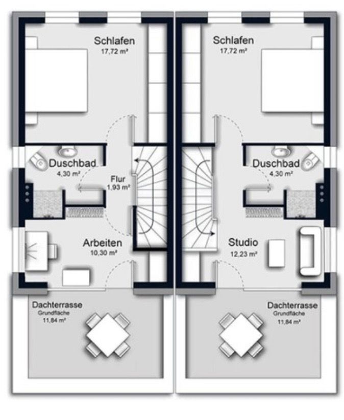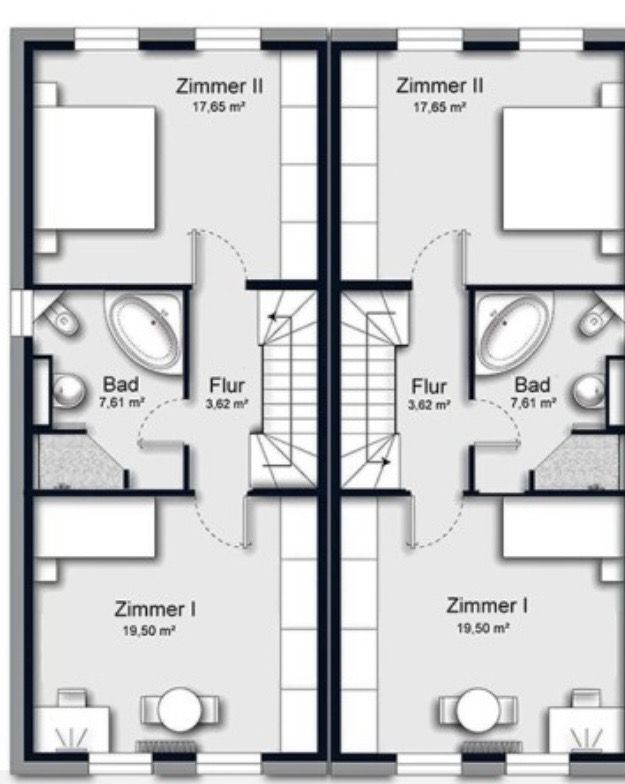 Im Dachgeschoss befinden sich 2 weitere Schlafzimmer und ein Duschbad (wahlweise möglich gegen Aufpreis).