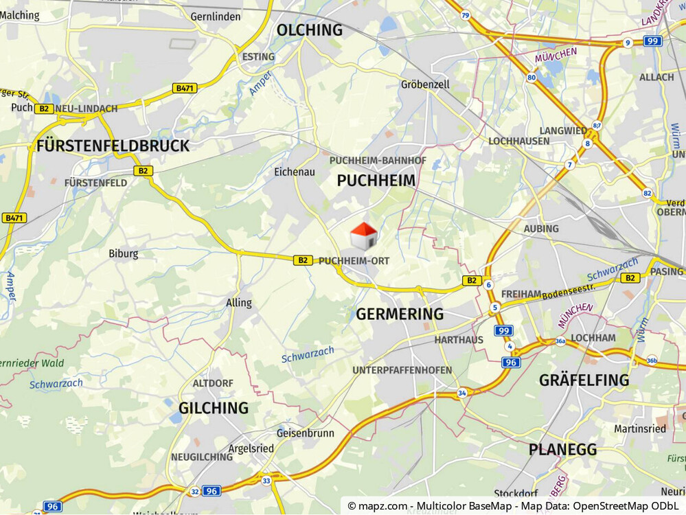 VERKEHRSANBINDUNGEN Puchheim liegt unmittelbar am Autobahnkreuz A96/A99, von wo Sie zum einen schnell an berühmten Ausflugszielen im Fünfseenland sind, zum anderen erreichen Sie in wenigen Minuten das Stadtzentrum von München. Puchheim ist an das Netz der S-Bahn München und damit an den Münchener ÖPNV angeschlossen. Es verkehrt die Linie S 4 von Geltendorf über München nach Ebersberg. Vom Bahnhof fahren verschiedene Busse quer durch Puchheim nach Germering, Olching, Eichenau, etc., sodass Sie alle Ecken problemlos öffentlich erreichen können.