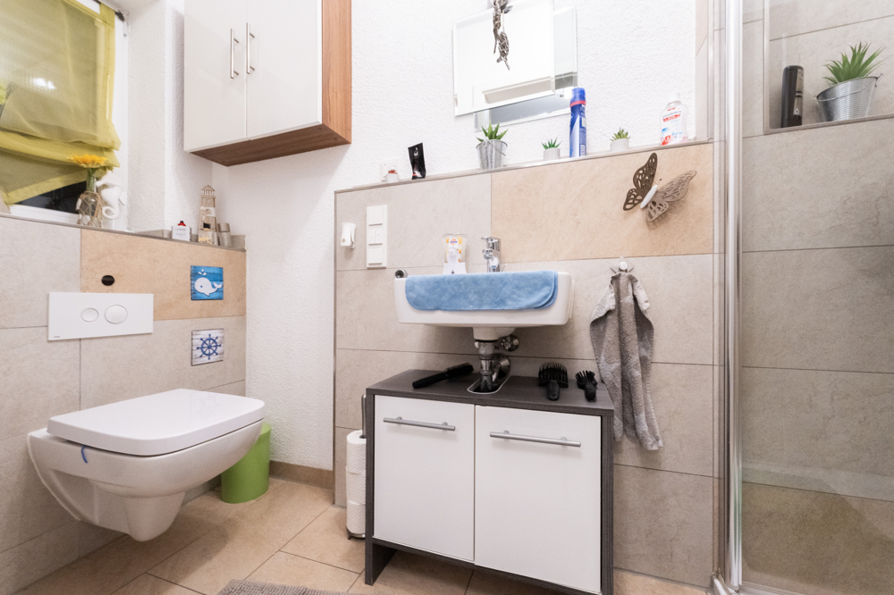 Im Obergeschoss befindet sich der Schlafbereich und Rückzugsort vom Alltag mit einem großzügigen Bad, mit Eckbadewanne und Dusche.