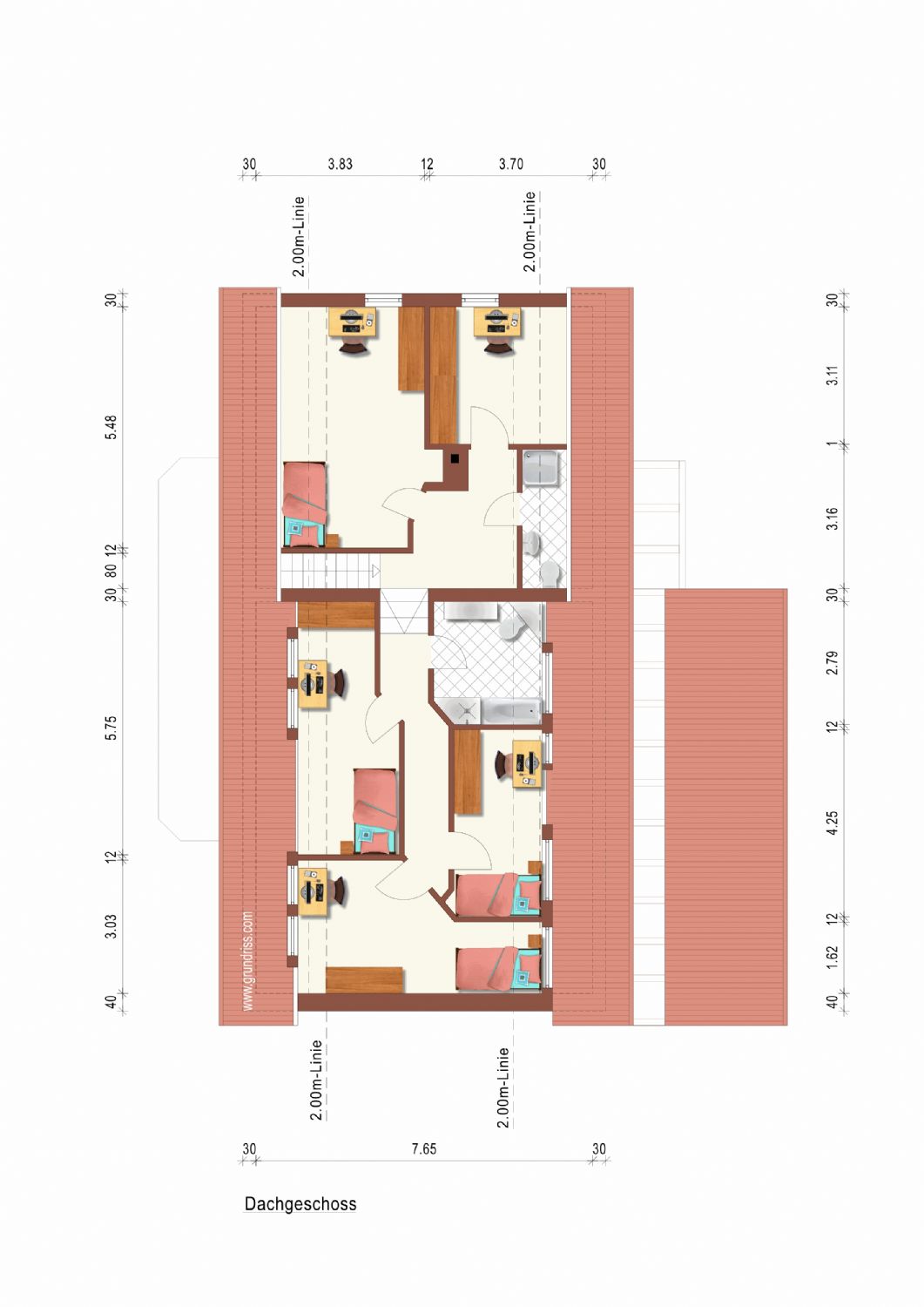 Im Dachgeschoss des Hauses sind im alten Teil zwei Zimmer und ein kleines Bad vorhanden. Dieser Teil sollte unter Umständen renoviert bzw. saniert werden. Im neuen Teil gibt es ebenfalls drei Schlafzimmer und ein Bad mit zwei Waschbecken, Badewanne und Dusche.