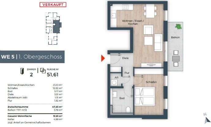 Zimmeranzahl :2 Gesamtgröße :ca. 51,00 m² Wohnfläche :ca. 51,60 m² Baujahr :2021 Frei ab :01.03.2026 Etage :1 Balkon :