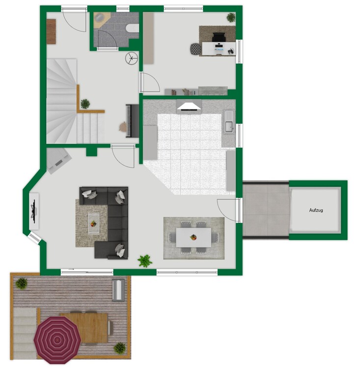 Vom Wohnbereich aus gelangt man auf die großzügige Terrasse mit Bangkirai-Belag, von der eine Treppe in den Garten mit Gartenhaus führt. Zusätzlich besteht vom Wohnzimmer aus die Möglichkeit, per außenliegendem Aufzug direkt in das Gartengeschoss zu gelangen. Über die Diele führt eine Treppe in das Gartengeschoss, wo der Hauptwohnung ein weiteres Zimmer zugeordnet ist. Auf dieser Ebene befindet sich zudem der Technik- und Heizungskeller, der gleichzeitig als Waschküche genutzt wird.