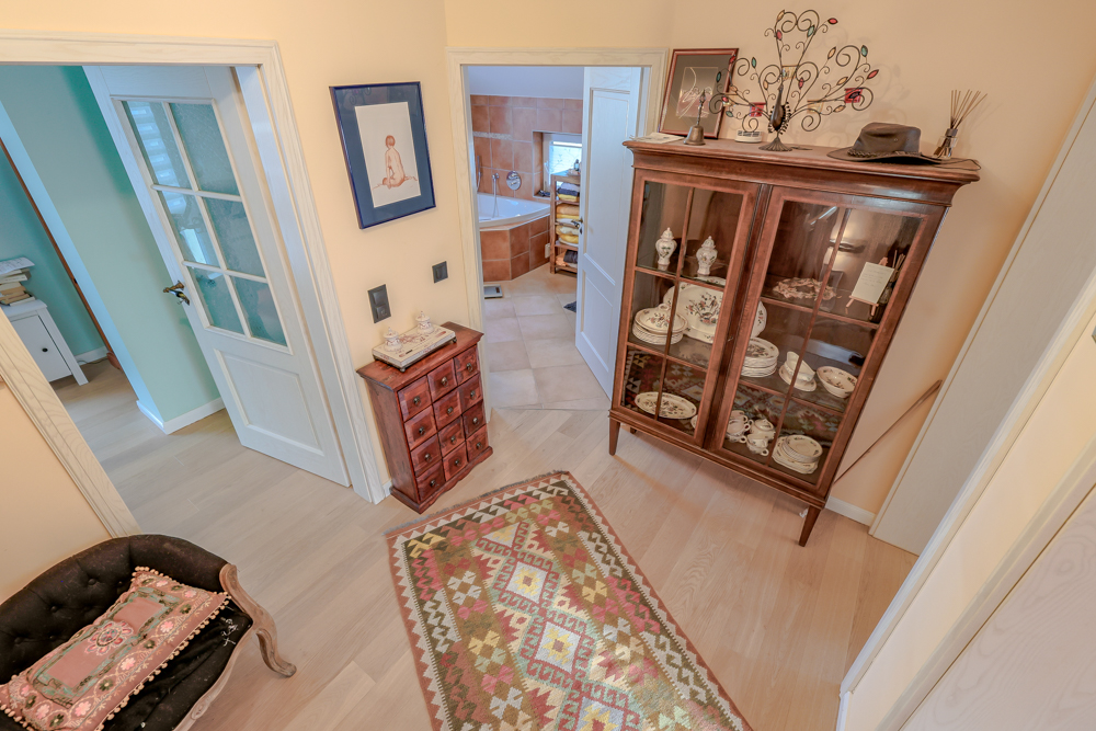 Im Obergeschoss stehen drei Zimmer sowie ein großzügiges Badezimmer zur Verfügung. Das Bad ist hochwertig ausgestattet und bietet eine integrierte Sauna, eine ebenerdige Dusche, eine Eckbadewanne mit Whirlpool-Funktion, einen Handtuchheizkörper sowie ein Fenster. Die durchdachte Planung ermöglicht komfortables Wohnen auch bei eingeschränkter Mobilität.