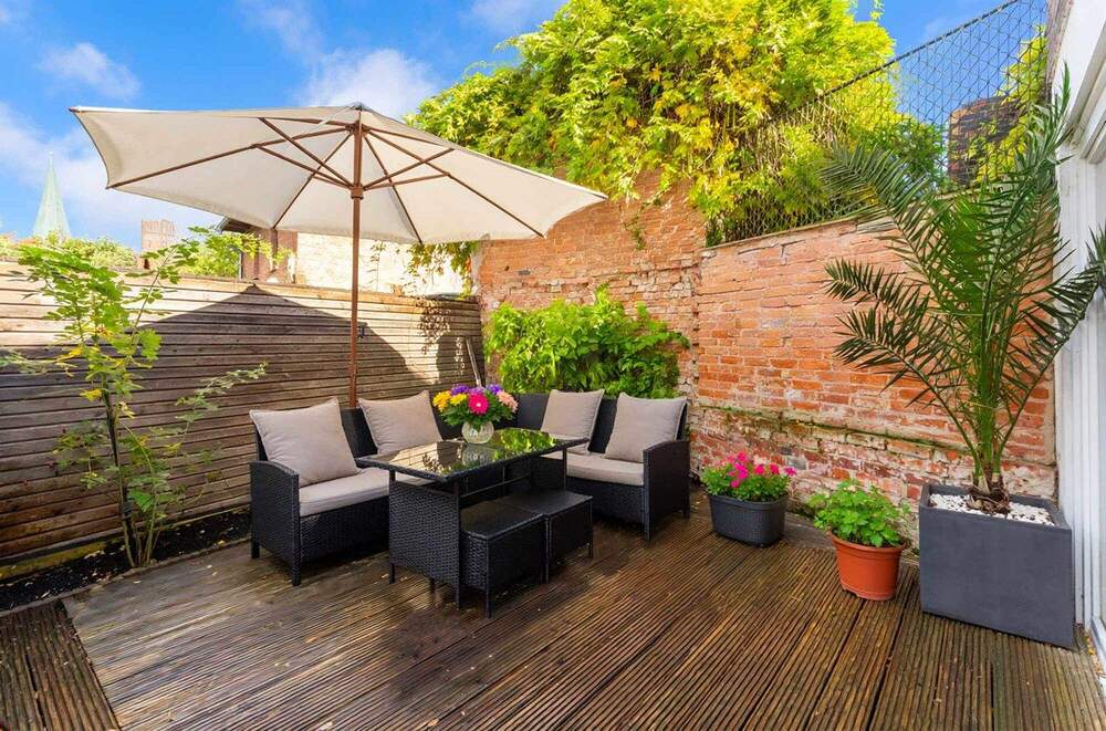 Stadthaus mit Innenhofterasse und Blick auf die Johanniskirche und den Wasserturm
