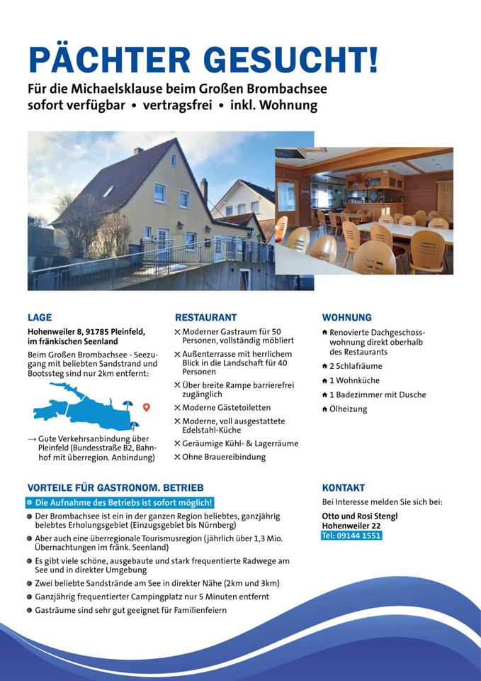 Sie befinden sich hier: Gaststätte Michaelsklause beim Brombachsee inkl.Wohnung zur Pacht in Pleinfeld - 3309250361-277-5863 | 1A-Immobilienmarkt.de
