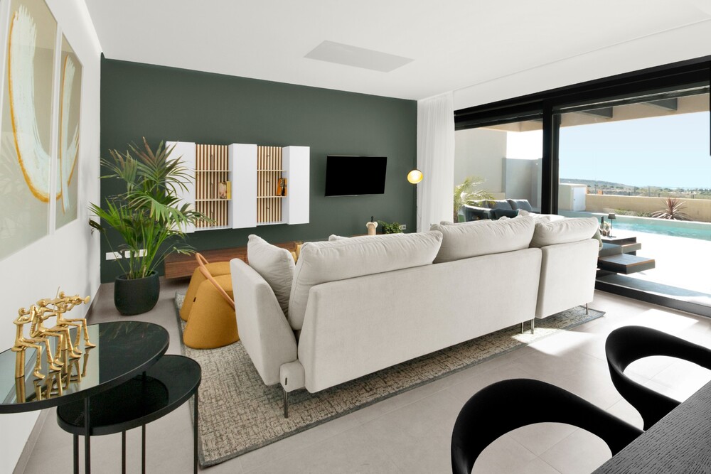 Brandneue Villen im modernen Stil mit 3 Schlafzimmern in Altaona Golf and Country Village, Corvera (Murcia), die speziell dafür entworfen wurden, endlose Ausblicke auf den Golfplatz, die Seen und die ferne Landschaft zu bieten, sowohl von innen als auch von außen. Die nach Süden ausgerichteten Gärten und Terrassen sorgen dafür, dass Sie die warme Wintersonne genießen können, und die großzügigen Glasfenster bieten zusätzliche Ausblicke auf die Region vom Komfort der Innenräume aus.
