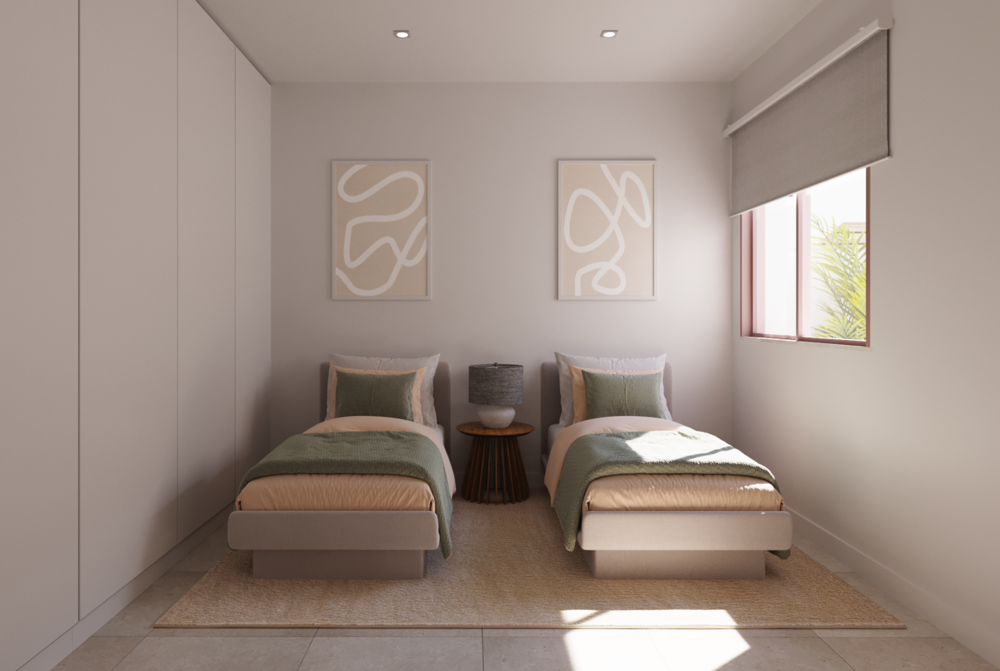 Die Villen wurden in einem zeitgenössischen Stil mit Holz-Imitat-Fliesen oder Naturstein entworfen. Sie haben die Wahl zwischen Villen mit 2 oder 3 Schlafzimmern und 2 Bädern, mit privatem Garten, privatem Parkplatz, Dachterrasse und privatem Swimmingpool. Die Grundstücksgrößen liegen zwischen 140m2 und 159m2, je nachdem, ob es sich um ein Haus mit 2 oder 3 Schlafzimmern handelt. Die Villen haben eine Größe zwischen 75m2 und 85m2, und die privaten Swimmingpools haben eine ungefähre Größe von 4, 5m x 2, 5m.