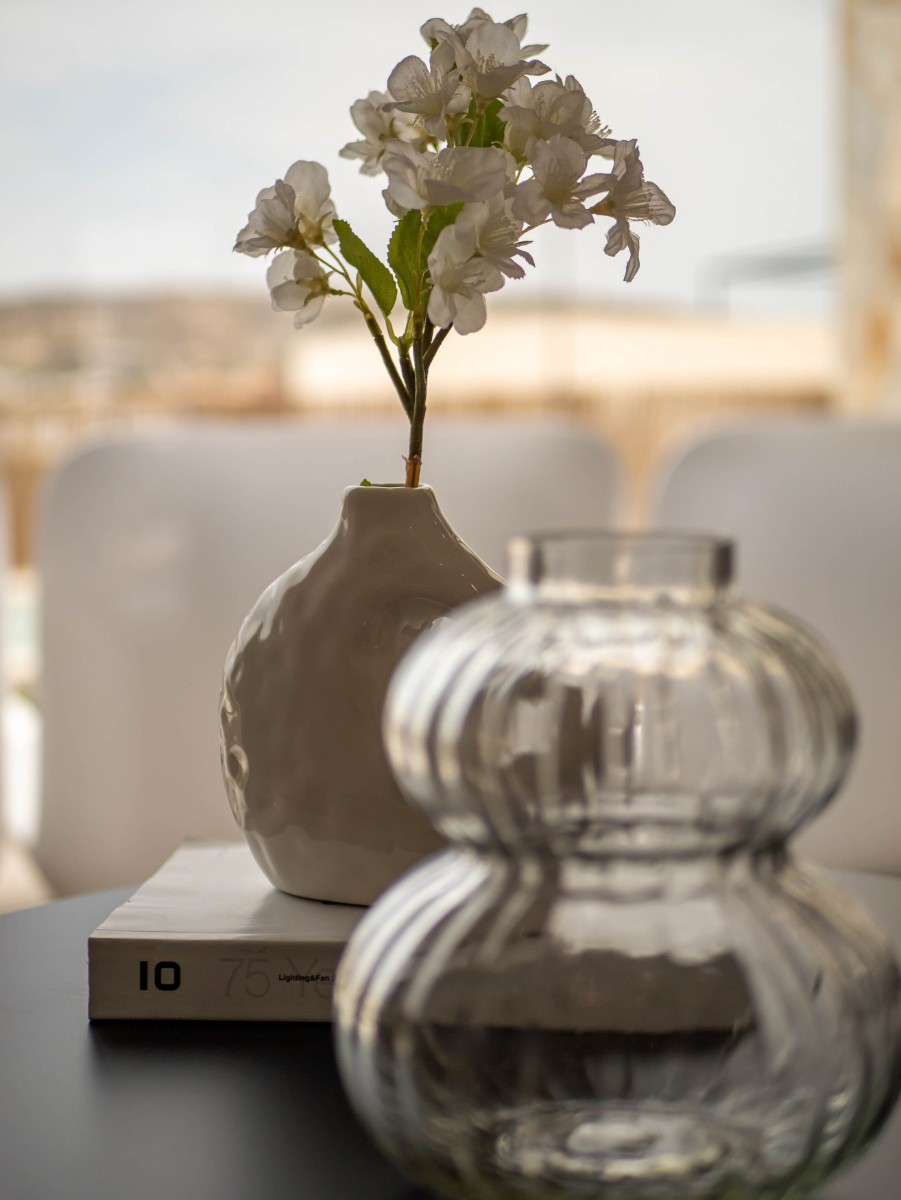 Der Innenbereich besteht aus einem Eingangsflur, der zum hellen und geräumigen Wohn- und Essbereich führt, der perfekt mit der voll ausgestatteten modernen Küche im amerikanischen Stil harmoniert, die in einem matten Weiß und kontrastierenden Oberschränken in der Farbe Amazon gestaltet ist. Auf der Erdgeschossebene befinden sich außerdem zwei Doppelschlafzimmer und ein separates Gästebad. Über die Innentreppe gelangt man in den ersten Stock, wo sich das große Hauptschlafzimmer mit eigenem Bad und eine separate Waschküche befinden. Sowohl der Flur im ersten Stock als auch das Hauptschlafzimmer haben direkten Zugang zur großen Sonnenterrasse, auf der man den ganzen Tag die Sonne genießen kann.