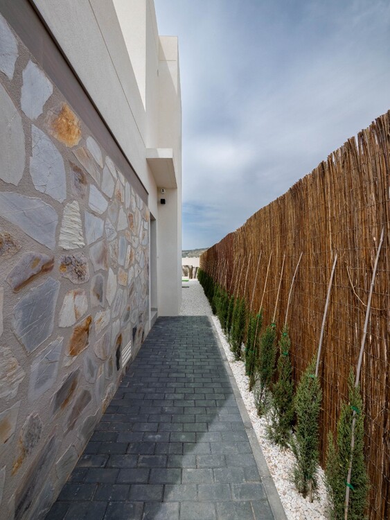 Diese Villen knüpfen an die alten mediterranen Kulturen und Bautraditionen an und verbinden sie mit moderner Architektur, um charmante Häuser zu schaffen, die Ihnen das Beste an Raum und Designtrends bieten. Das Design kombiniert moderne Linien mit traditionellen Elementen wie Stein an der Fassade und Holz, die die Wärme der traditionellen Bauweise vermitteln. Das offene Konzept der Häuser maximiert die Nutzung des natürlichen Sonnenlichts während des Tages und verbessert die Privatsphäre und die Querlüftung.