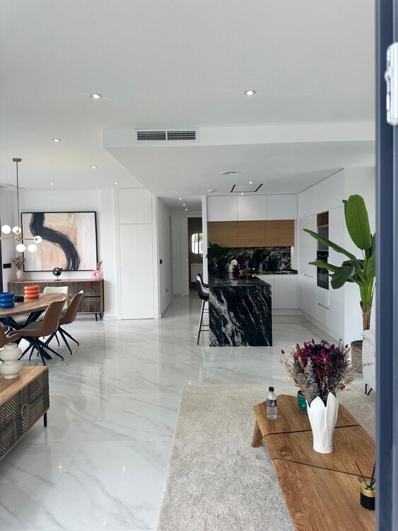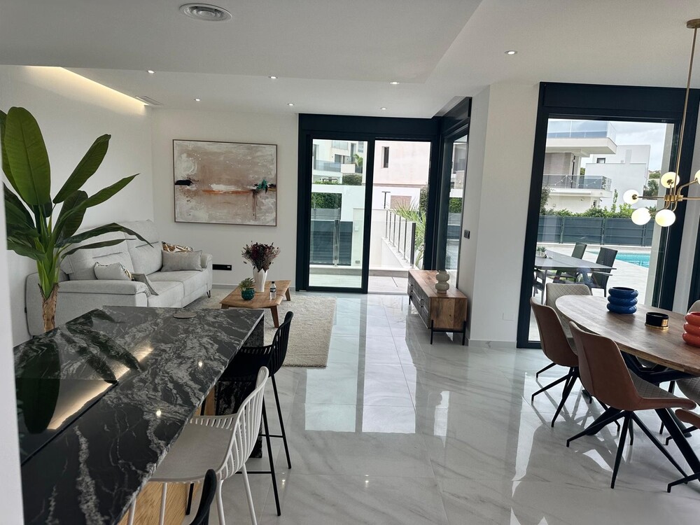 Die Immobilie verfügt über eine vorinstallierte Klimaanlage, Fußbodenheizung in den Bädern, elektrische Küchengeräte (Backofen, Cerankochfeld, Dunstabzugshaube, Kühl-Gefrierkombination, Geschirrspüler und Waschmaschine), Einbauschränke in allen Schlafzimmern, LED-Beleuchtung innen und außen, elektrische Rollläden, Video-Gegensprechanlage, einen Garten mit weißem Kies und Kunstrasen, einen privaten Swimmingpool mit Solardusche und eine private Garage mit motorisiertem Eingangstor.
