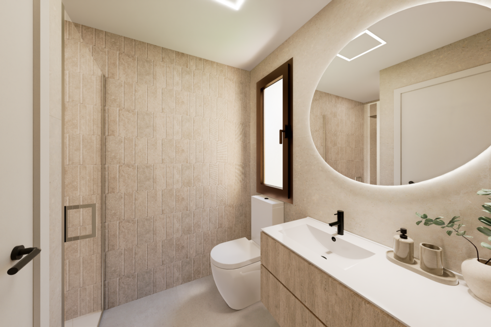 Jede Wohnung wurde so konzipiert, dass sie möglichst viel natürliches Licht erhält und so Räume schafft, in denen Komfort und Eleganz zusammenkommen. Die Wohnungen verfügen über drei separate Zugänge und Treppenhäuser, die für mehr Privatsphäre und Komfort sorgen. Die Innenausstattung besteht aus einem hellen und geräumigen, offenen Wohn- und Essbereich mit großen Fenstern, die sich zur privaten Terrasse hin öffnen. Im Hauptwohnbereich befindet sich eine Küche im amerikanischen Stil mit funktionellem Design, modernen Möbeln und intelligenten Räumen, und neben der Küche gibt es einen separaten Waschraum. Zu jeder Wohnung gehört auch eine Primärsuite, die für mehr Komfort und Abgeschiedenheit sorgt. Im Gegensatz zu den offenen, gläsernen Hotelbädern bietet die Primary Suite eine vollständige Trennung zwischen dem Schlafbereich und dem Badezimmer, so dass eine ruhige, ungestörte Nachtruhe ohne Licht-, Lärm- oder Geruchsbelästigung gewährleistet ist. Dieses Schlafzimmer wurde mit Blick auf das Wohlbefinden geschaffen und bietet eine ruhige und funktionelle Umgebung für diejenigen, die echten Komfort zu Hause schätzen. Darüber hinaus gibt es zwei weitere, gut geschnittene Doppelzimmer und ein separates Gästebad. Die Wohnungen im obersten Stockwerk verfügen über eine Außentreppe auf der Sonnenterrasse, die auf die weitläufige Dachterrasse mit einer Fläche von über 45 m2 führt, wo man den ganzen Tag die Sonne genießen kann.