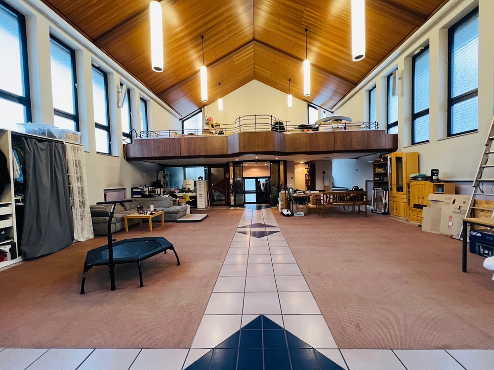 Erdgeschoss (EG): • Großzügiger, lichtdurchfluteter Kirchenraum • Zusätzliches Zimmer mit Glasfront (ideal als Büro nutzbar) • Raumhöhe bis ca. 7, 90 m (Teilweise bis zur Decke offen) • Gut geeignet für den Einbau von zwei Etagen