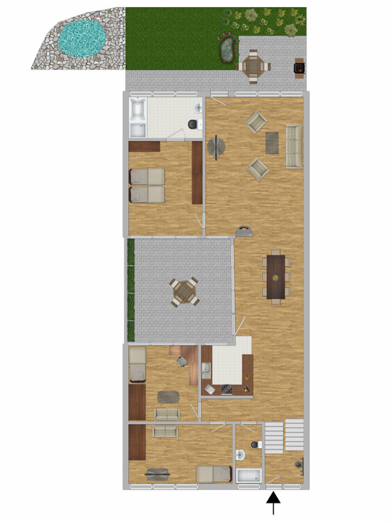 Vom Essbereich aus betreten Sie das sichtgeschützte Atrium, das als erste Terrasse dient und zum entspannten Verweilen einlädt. Eine zweite Terrasse ist direkt vom Wohnzimmer zugänglich und bietet zusätzlich eine liebevoll angelegte Gartenfläche sowie einen Sitzpool.