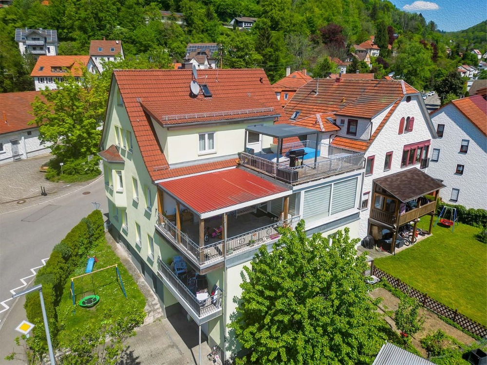Luftaufnahme - Mehrfamilienhaus in Bad Urach zu verkaufen.zoom
