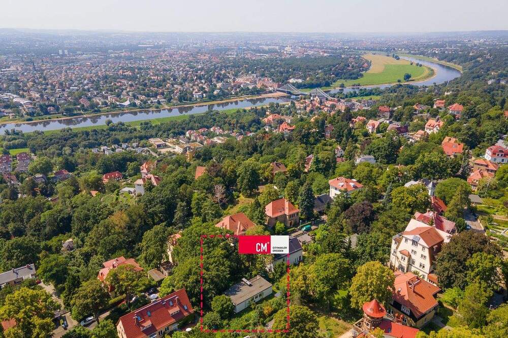 Luftbild Umgebung und Blick zur Immobilie - Wohnarchitektur mit Substanz und Entwicklungspotenzial in Toplage am Loschwitzer Elbhang!