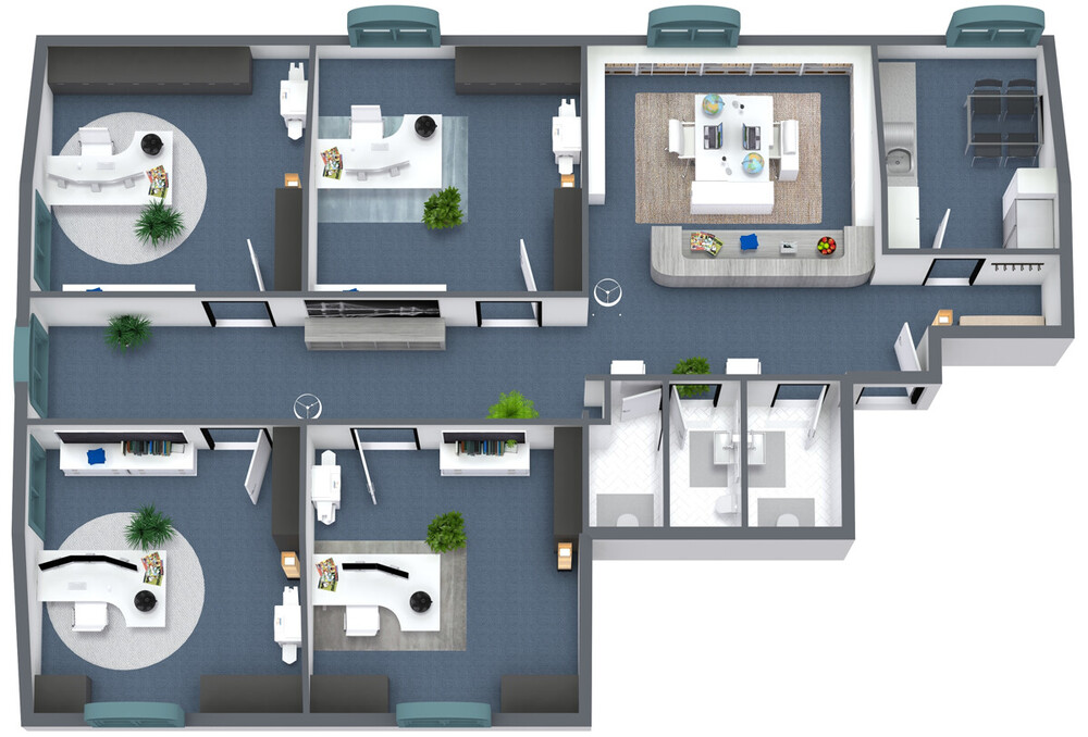 • 4 großzügige helle Büroräume • Empfang • separate Küche • Flur • WC Damen und Herren