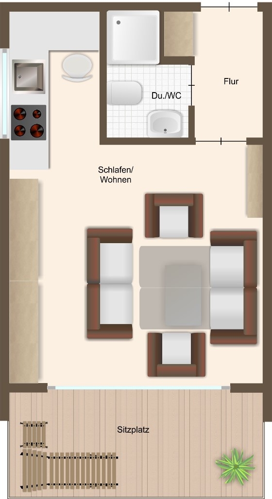 - Laminatboden - Bad mit Dusche und WC - doppelt verglaste Kunststofffenster - Küchenzeile