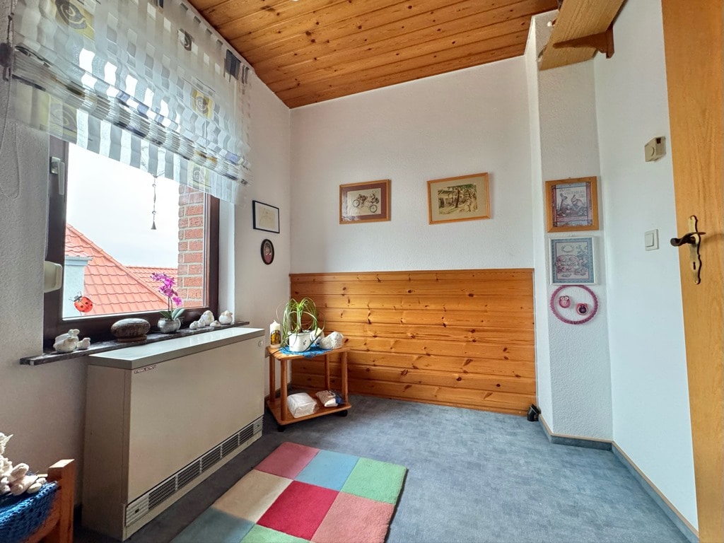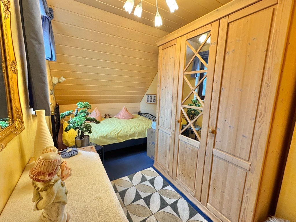 Über die Treppe im Flur gelangen Sie ins Dachgeschoss, wo ein Schlafzimmer, ein Gästezimmer, sowie ein Kinderzimmer mit einem angrenzenden Durchgangszimmer zur Verfügung stehen. Dieses bietet sich ideal als kombinierter Kinder- und Schlafbereich an.