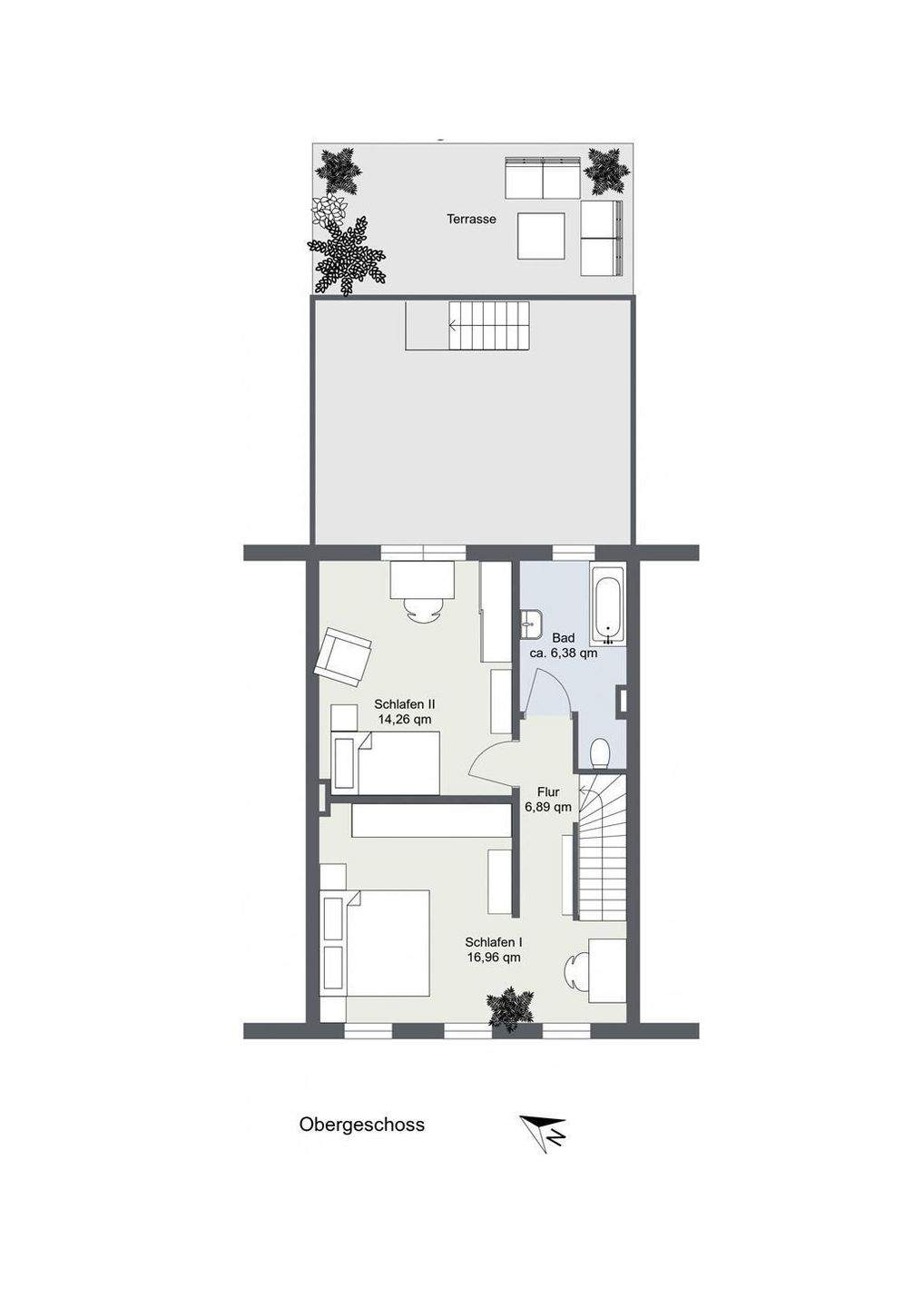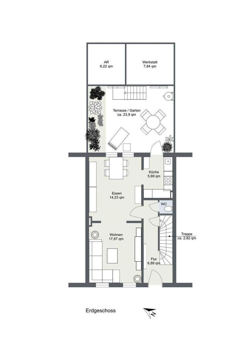 • Blick in den Garten und auf die (Dach)-Terrasse -