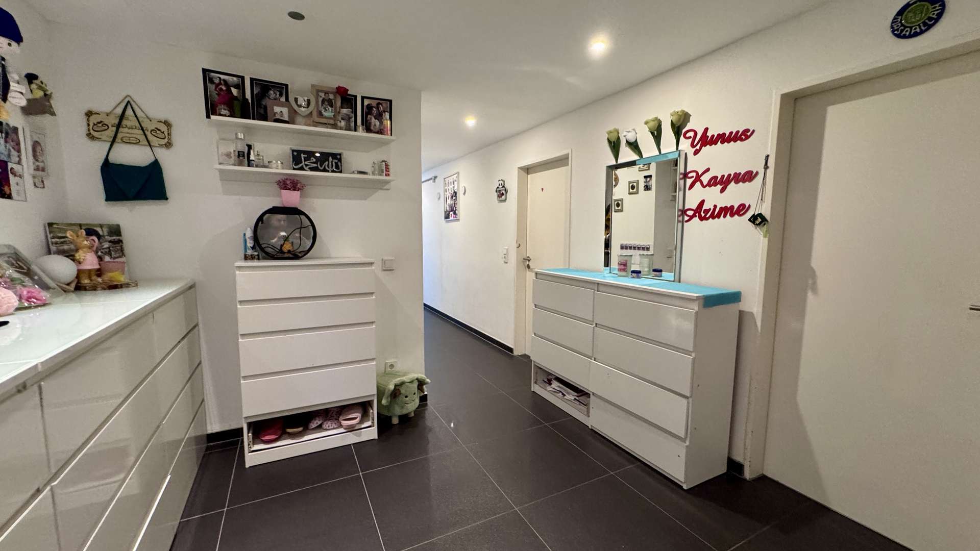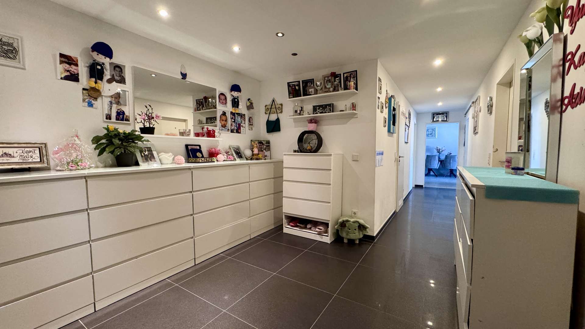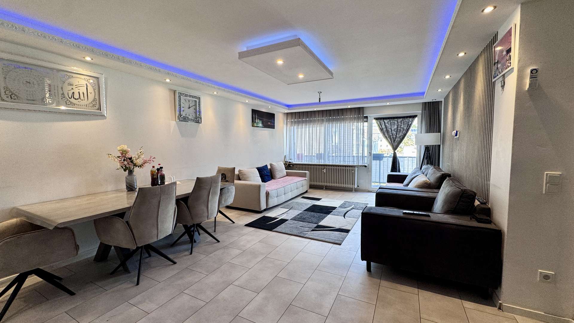 Die indirekte LED-Dekobeleuchtung im Wohnzimmer, die in über 64 Farben anpassbar ist, schafft eine stilvolle und stimmungsvolle Atmosphäre. Die in die Wände integrierte LAN-Verkabelung ermöglicht eine perfekte digitale Infrastruktur – ideal für Homeoffice und moderne Mediennutzung.
