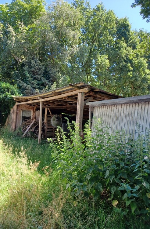 Neben dem Wohnhaus sind auf dem Grundstück mehrere Nebengebäude vorhanden. Hierzu zählen ein verputzter Mauerwerksbau (ehemaliges Kochhaus) aus den 1960er Jahren mit einer Nutzfläche von etwa 20 m² sowie ein weiterer Stall- und Schuppenkomplex mit einer geschätzten Nutzfläche von etwa 121 m², unterteilt in Stall-, Vorrats- und Abstellräumen/Lager. Die Nebengebäude bestehen überwiegend aus einfachem Mauerwerk, teilweise einschalig mit Holzständerkonstruktion und Verkleidung aus Bitumenwellplatten. Sämtliche Nebengebäude sind unbeheizt und verfügen über keine sanitären Einrichtungen. Die Nebengebäude weisen verschiedene alters- und nutzungsbedingte Schäden sowie bauliche Beeinträchtigungen auf, darunter Risse im Mauerwerk, defekte Türen und teilweise eingestürzte Dach- und Wandabschnitte. Zusätzlich befinden sich auf dem Grundstück noch weitere bauliche Anlagen die sich als Schuppen, einen Unterstand sowie eine Stahlblechgarage abbilden. Die Grundflächen dieser Nebengebäude liegen zwischen 13 m² und 59 m² und sind zu rund 1/3 auf dem Nachbargrundstück errichtet und weitgehend stark baufällig. Aus Sicherheitsgründen ist ein Betreten nicht gestattet. Die Freifläche um Wohnhaus und Wirtschaftsgebäude wird seit Jahren nicht gepflegt und ist stark verwildert.
