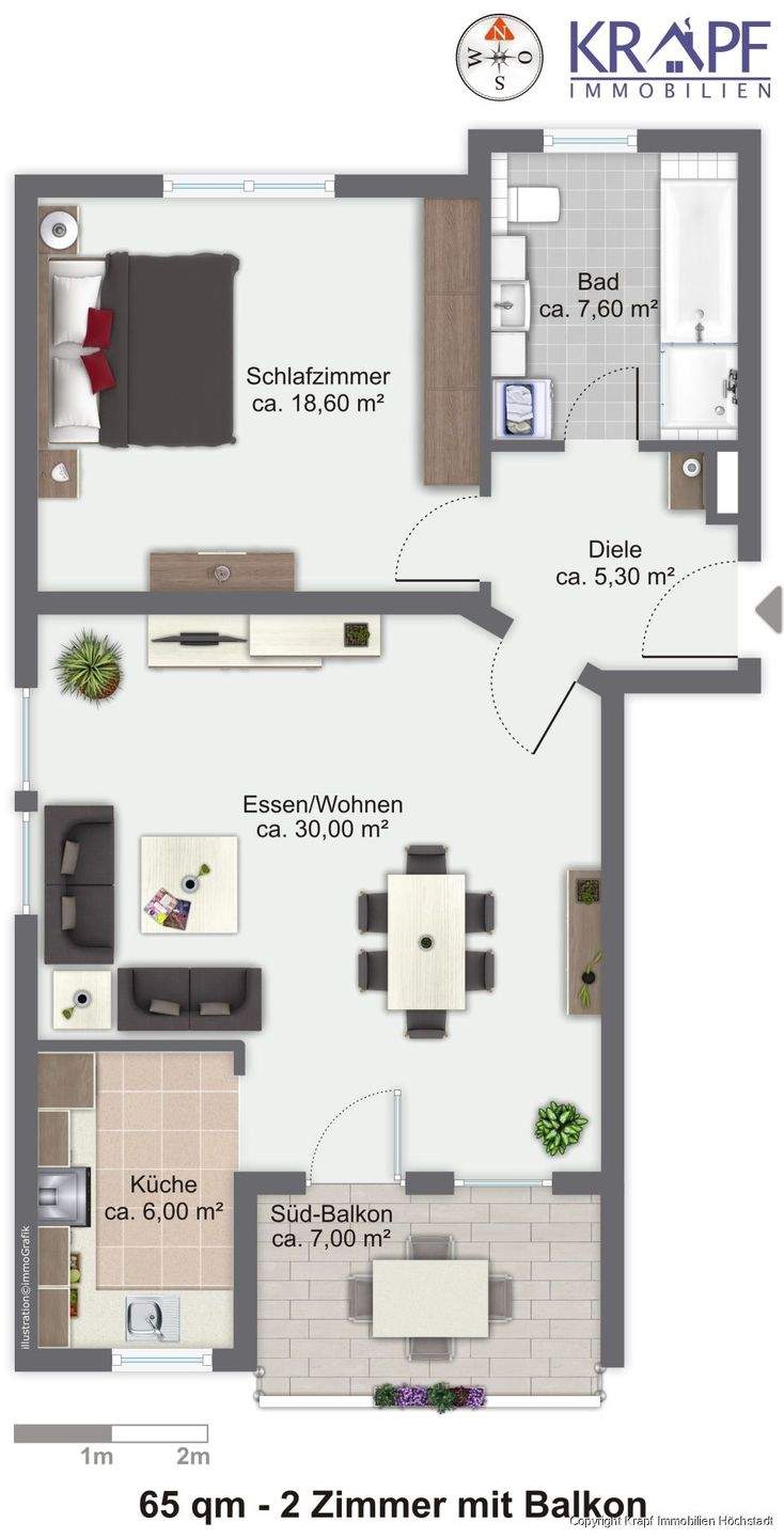 Zimmeranzahl :2 Wohnfläche :ca. 65,00 m² Baujahr :1995 Frei ab :sofort Etage :1 Balkon :