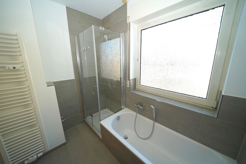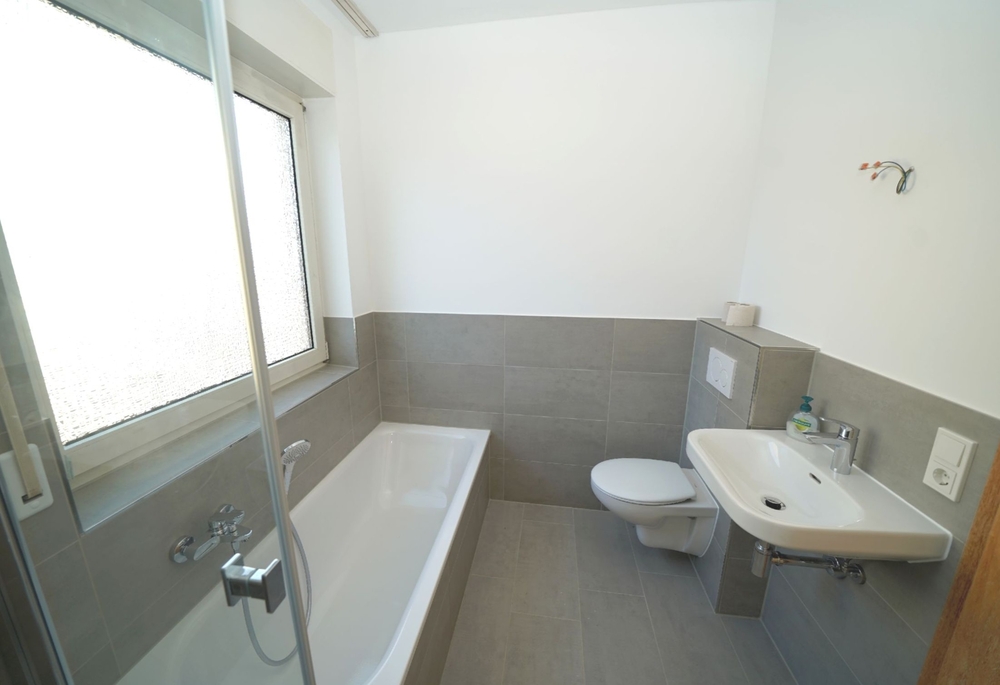 Vom Flur gelangen Sie in das geräumige Wohnzimmer, das Arbeitszimmer/Kinderzimmer sowie in die Küche und das Badezimmer. Das Schlafzimmer betreten Sie durch das Wohnzimmer. Die Küche bietet zudem einen zusätzlichen direkten Zugang zum Wohn-/Esszimmer. Das helle und nagelneue Tageslicht-Badezimmer verfügt sowohl über eine Wanne als auch eine Dusche. Eine praktischer Handtuchheizkörper ist dort ebenfalls vorhanden.