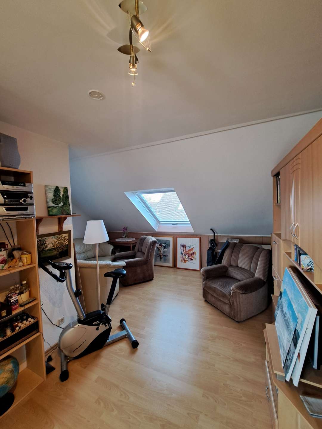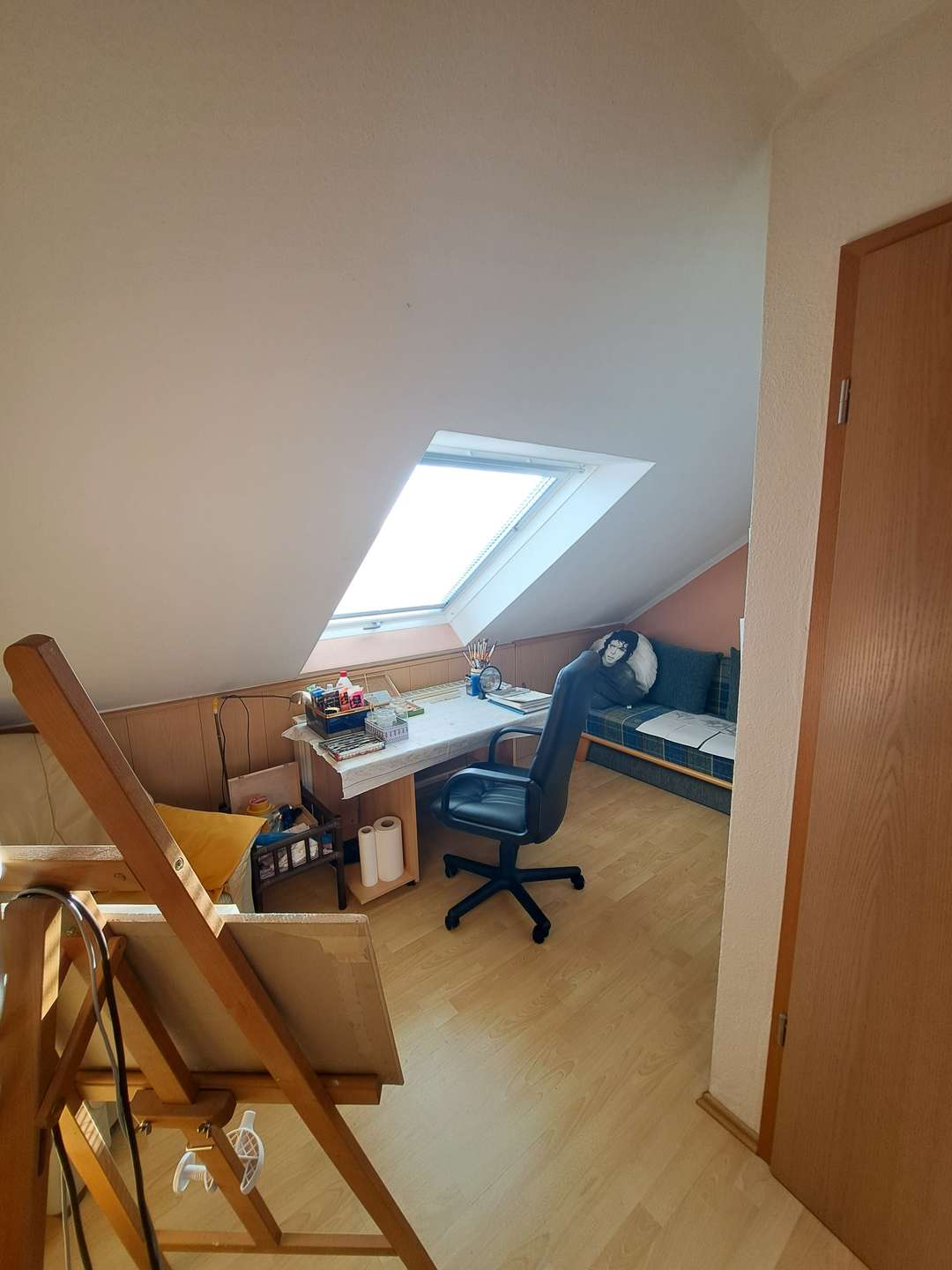 Das Dachgeschoss ist mit dem dritten Schlaf-/Arbeitszimmer gemütlich ausgebaut und könnte auch weiter unterteilt werden. In den unteren Schrägen ist zusätzlicher Stauraum vorhanden.