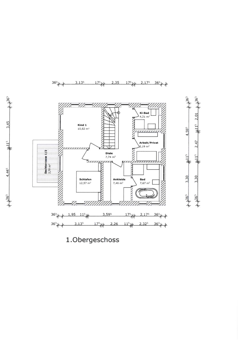 Das auf dem Grundstück zu errichtende Einfamilienhaus kann mit den Maßen 8, 74 Meter x 8, 74 Meter gebaut werden. Es kann ein Erdgeschoß, ein Obergeschoß und ein Dachgeschoß erstellt werden. Eine Planung mit Ansicht des Hauses, Schnitt, Grundrisse sowie den entsprechen Maßen und Größen fügen wir bei.