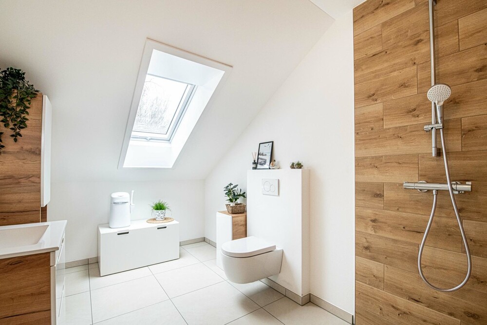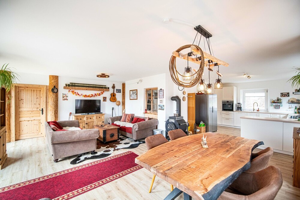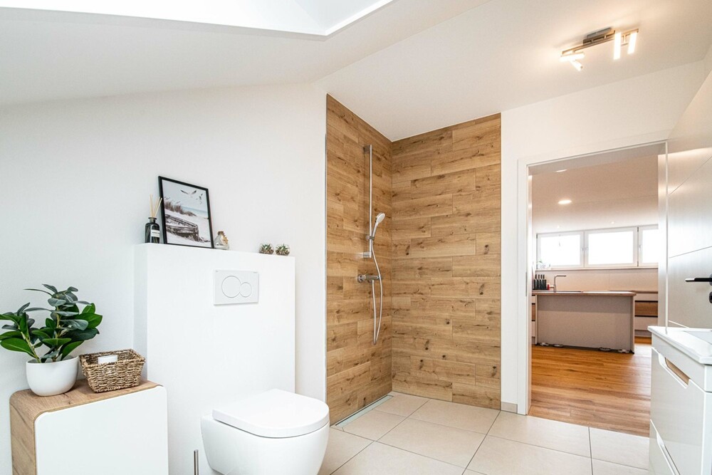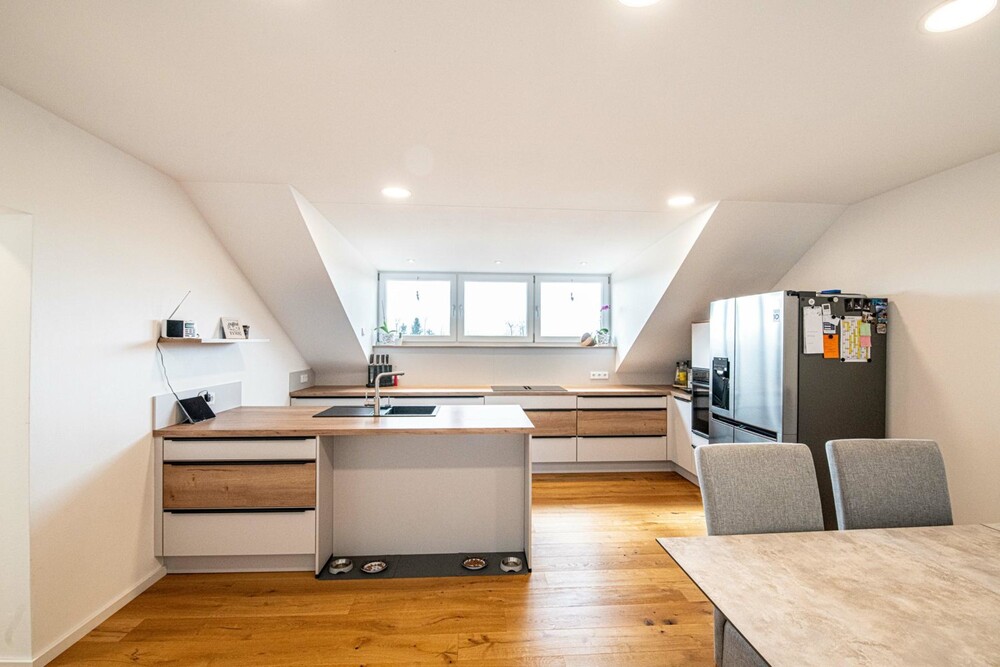 Über eine moderne Eichenholztreppe gelangen Sie eine Etage höher direkt in den lichtdurchfluteten Wohnraum mit einem 3-seitig verglasten Kaminofen für heimelige Winterabende und einer Sonnendachterrasse für den Aufenthalt im Freien sowie einer modernen Küche, die keine Wünsche offenlässt, mit anschließendem Essbereich. Eine Gästetoilette mit Duschbad sowie ein Vorratsraum runden das Platzangebot auf dieser Etage ab.