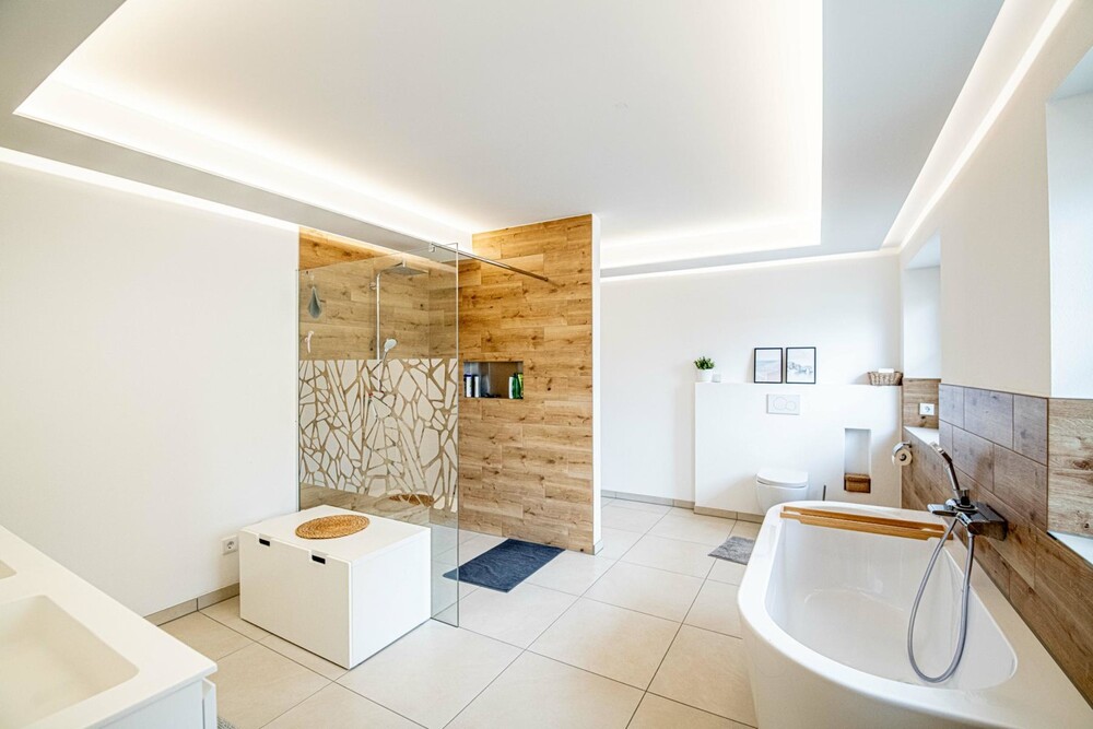 Im Erdgeschoss auf rd. 108 m² lässt es sich ebenerdig in einem offenen Koch-/Wohn- und Essbereich mit moderner Küche und Kaminofen, einem Schlafzimmer sowie einem großzügigen Bad mit ebenerdiger "Schneckendusche" komfortabel wohnen. Die Bodenplatte für einen baulich genehmigten Wintergarten im Anschluss an den Wohnbereich mit einer Fläche von rd. 25 m² wurde bereits erstellt und wird derzeit über den Zugang vom Wohnbereich als Terrasse genutzt.