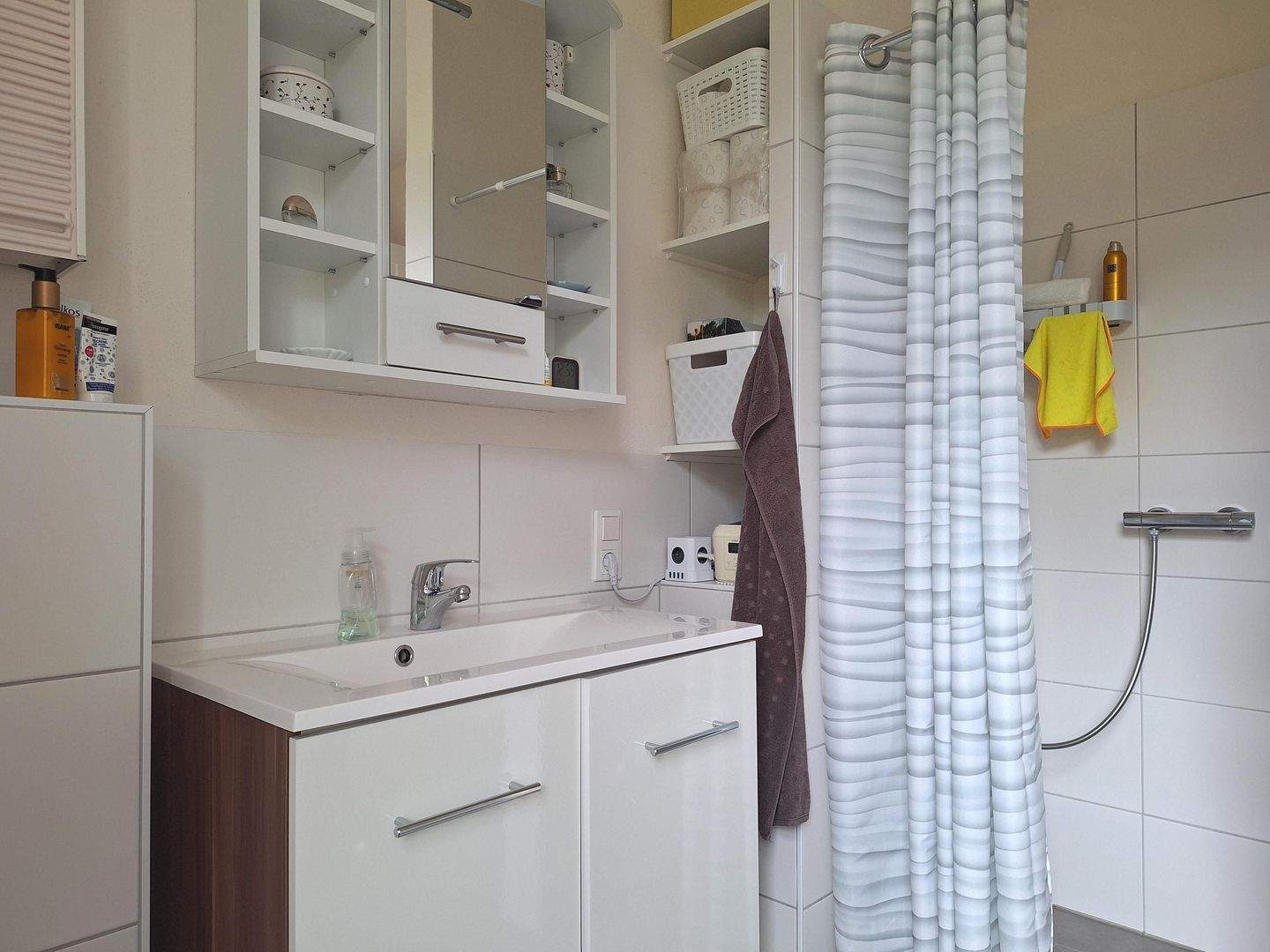 • Kleinste Whg. unten rechts, Blick zum Waschbecken und zur Walk-In-Dusche -