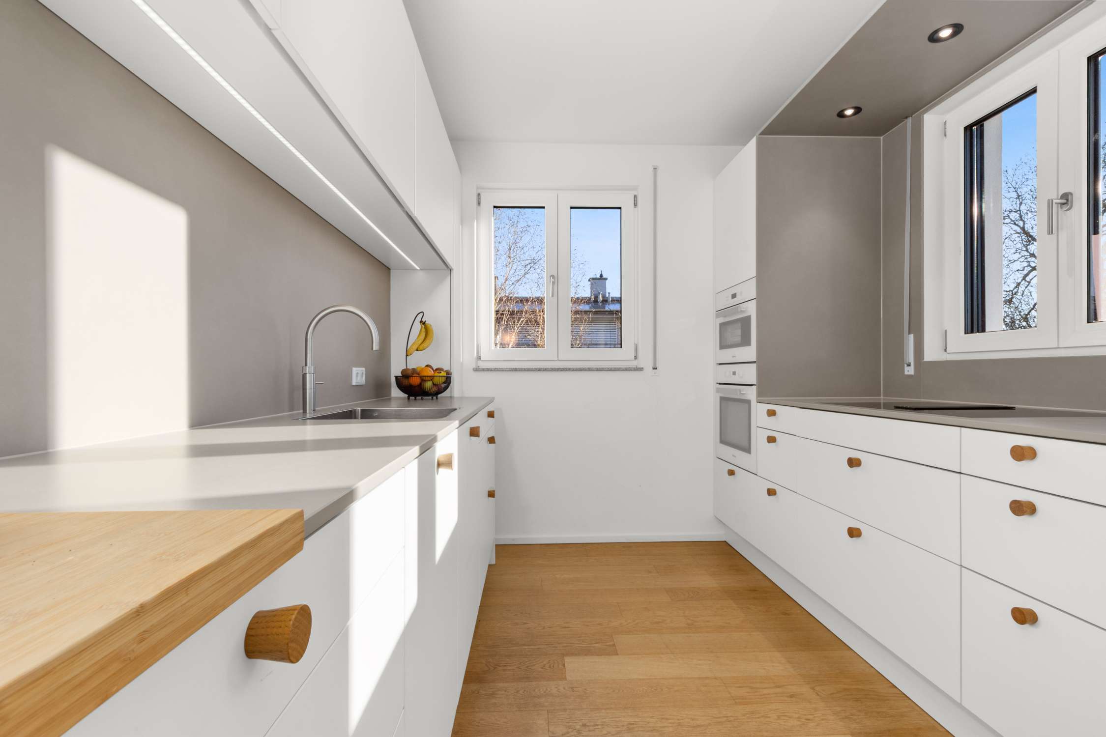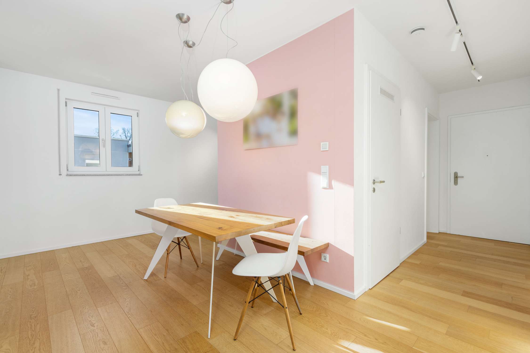 Vorbei an Einbau-Garderobe, Gäste-WC mit Platz für Waschmaschine und Trockner, sowie der praktischen Abstellkammer, findet sich das Herzstück der Wohnung in Form des offenen Essbereichs. Einem kommunikativen Ort, der alle Wohnräume verbindet und die Bewohner zusammenführt. Die in jeder Hinsicht liebevoll geplante Einbauküche in moderner, cleaner Optik und soliden Elektrogeräten namhafter Hersteller, trägt mit LED-Lichtband und Downlights entsprechend zum Ambiente bei.