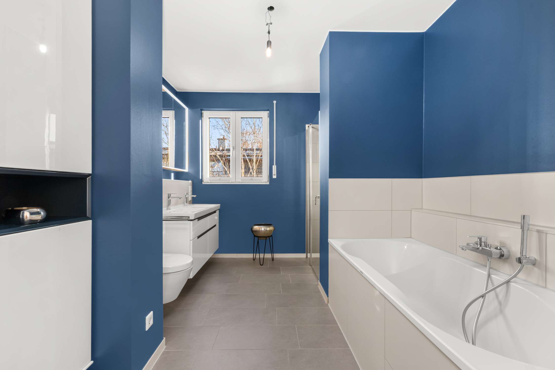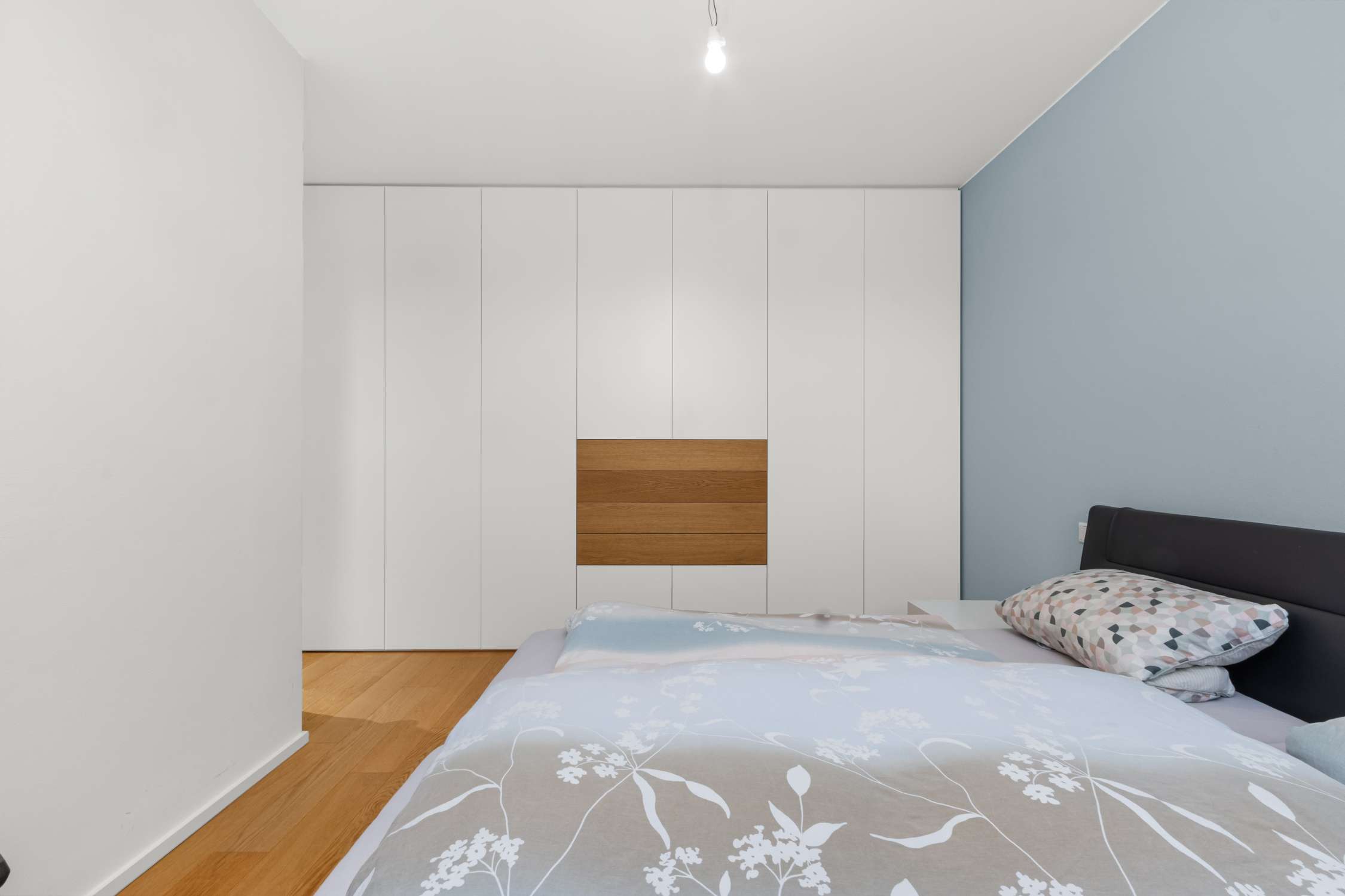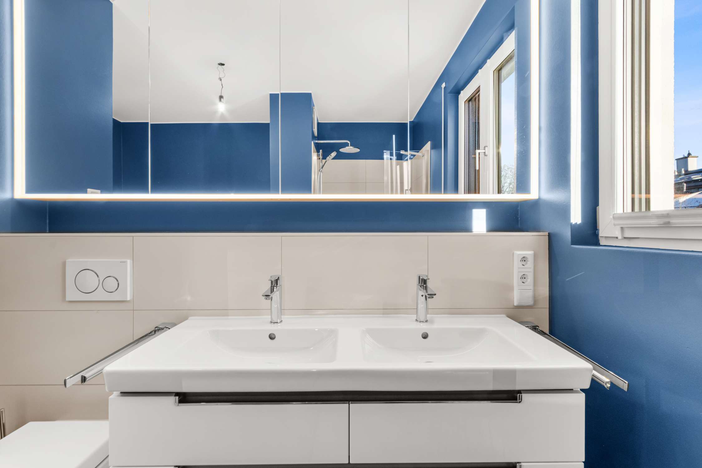 Gleich drei beliebig nutzbare Wohnräume (Schlafzimmer, Kinderzimmer, oder Homeoffice?) sind wie die übrigen Wohnräume mit Eichenparkett und wohliger Fußbodenheizung versehen. Der Master-Bedroom beeindruckt mit einem geräumigen Einbauschrank - durchdacht geplant und mit integrierter Beleuchtung. Das natürlich belichtete und belüftete Badezimmer lässt auf rd. 10m² keine Wünsche offen: Mit Doppelwaschtisch inkl. Unterschrank, beleuchtetem Spiegelschrank, Badewanne UND bodenebener Dusche mit Glasabtrennung und Rainshower-Duschkopf sowie einem obligatorischen Handtuchheizkörper wurde hier wirklich an alles gedacht.