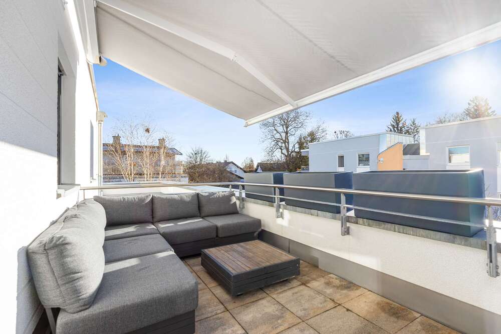 Ein Regalsystem bietet Platz für die Bibliotheken auch umfangreicher ausgestatteter Leser und stellt eine gekonnte Verbindung zum privaten Wohnbereich her, der Fernseher & Co. dank Schiebetüren in der passgenauen HiFi-Wohnwand verschwinden lässt. Wie der Wohnbereich ist auch die gut 15m² große Dachterrasse wunderbar nach Süden ausgerichtet, wo eine große Markise an heißen Sommertagen den nötigen Schatten spendet.