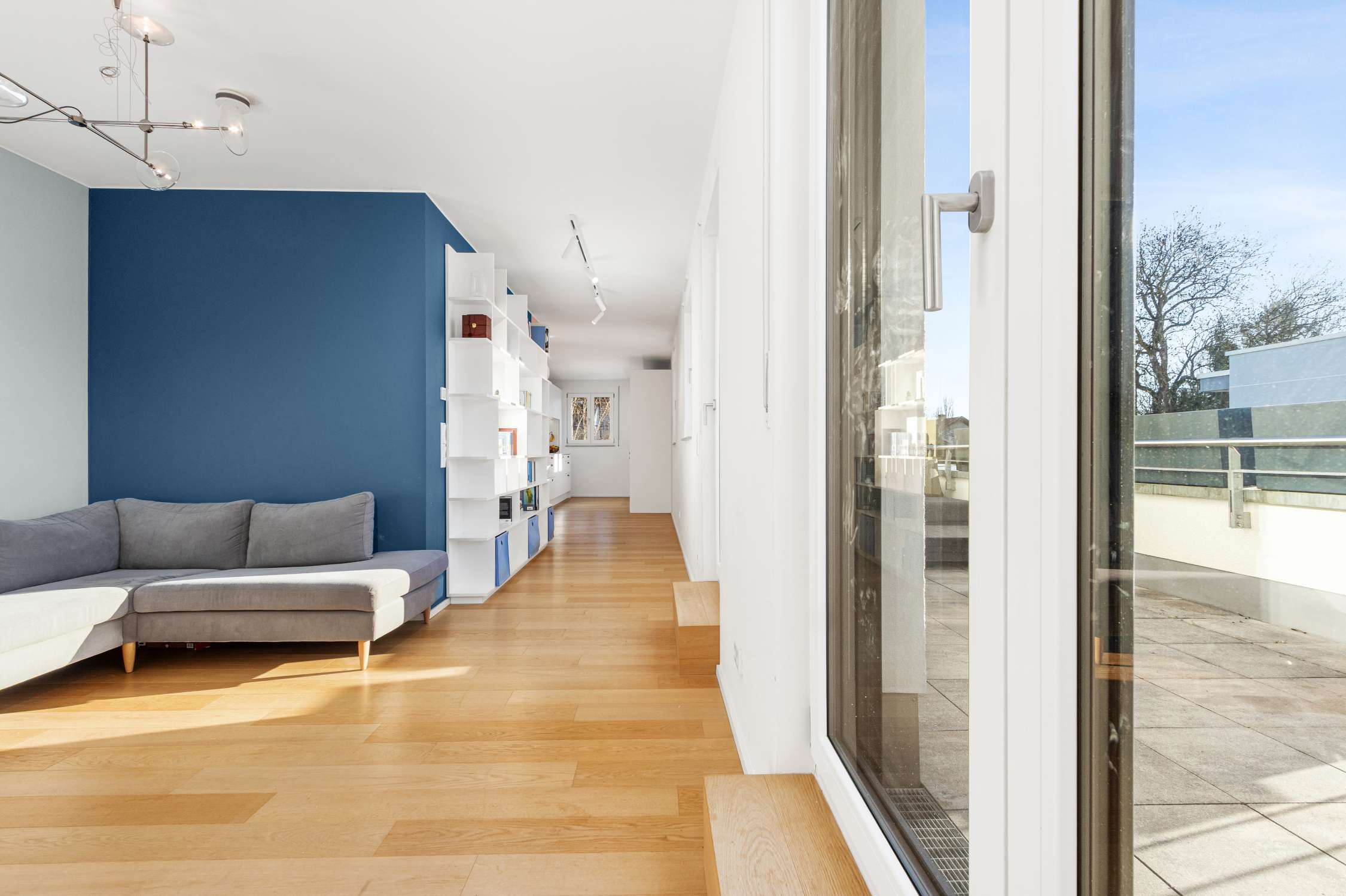 ✔️ Hochwertige Schreiner-Küche mit Ceramic-Arbeitsplatte, Induktionskochfeld mit integriertem Dunstabzug, Kühl-/Gefrierschrank, Backofen, Dampfgarer, Geschirrspüler, sowie Qooker Kochendwasserhahn uvm. ✔️ Praktische Schreiner-Garderobe am Eingangsbereich in Eiche, weiß mit stylischem LED-Profil ✔️ Geräumiger Schreiner-Schlafzimmerschrank (8-Türer) mit viel Stauraum in Eiche, weiß mit automatischer LED-Beleuchtung ✔️ Clevere Schreiner-Wohnwand im Wohnzimmer mit Paneel-System in Eiche, natur & blau ✔️ Großes Bibliothek-Regalsystem in weiß ✔️ XXL-Markise (ca. 7, 0m x 2, 5m) grau betucht, und elektrisch gesteuert mit Handsender