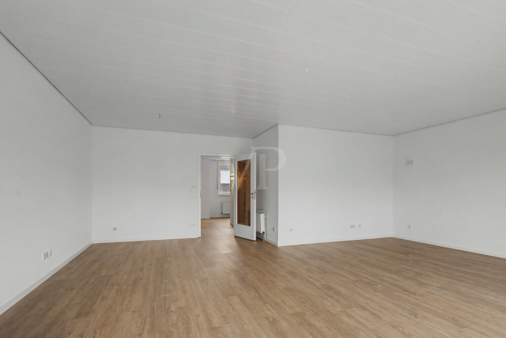 -Erstbezug nach umfassender Renovierung -Heller, moderner Designboden in Holzoptik in allen Wohn- und Schlafräumen -Großzügiger Wohn- und Essbereich mit großer Fensterfront -Zugang zum Südbalkon über bodentiefe Türelemente -Separate Küche mit Fliesenboden und Einbauküche -Modernes Badezimmer im Dachgeschoss -Neue Dusche und neue Badewanne -Neues Wandhängendes WC mit Unterputz-Spülkasten -Neuer Spiegelschrank mit Moderner Waschtisch mit Holzunterschrank -Großformatige Boden- und Wandfliesen -Große Fensterfront im Wohnzimmer mit Schiebetür -Separates Gäste-WC -Holztreppe zwischen den Wohnebenen -Helle Schlaf- und Arbeitszimmer mit angenehmen Raumgrößen -Weiße Innentüren und Zargen -Zeitloses, neutrales Ausstattungskonzept -Abstellflächen im Keller und im Dachgeschoss