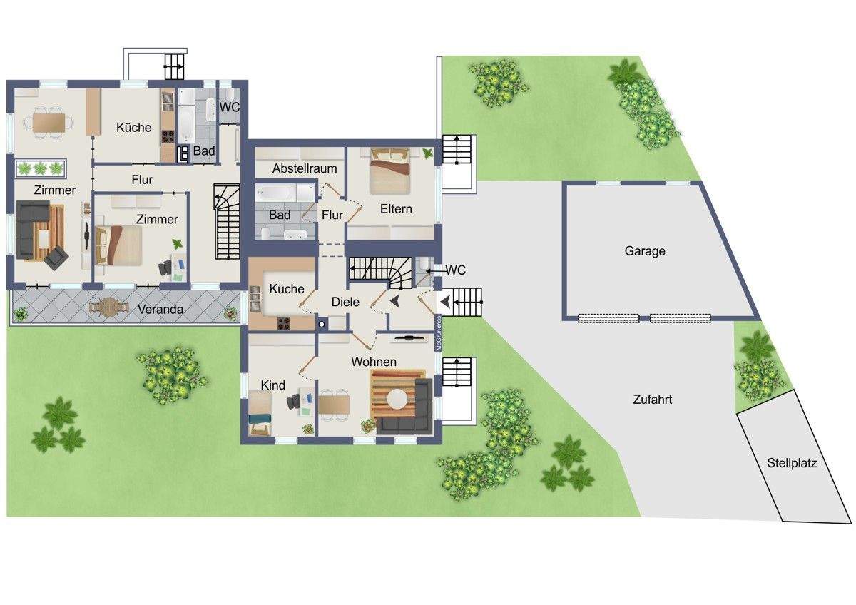 Zwei Häuser auf großem Grundstück