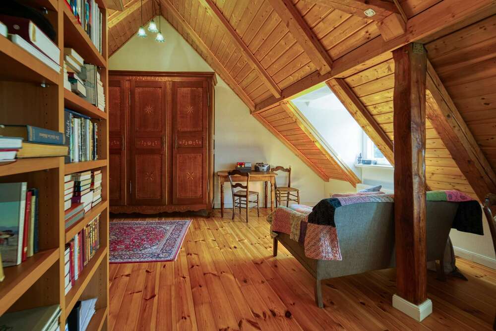 Der Anbau beinhaltet eine Garage im Erdgeschoss und darüberliegend ganz besondere Räume die als einzigartiges Atelier, Jugendzimmer/Wohnung oder Gästezimmer dienen können. Auch ein repräsentatives Büro wäre hier denkbar.