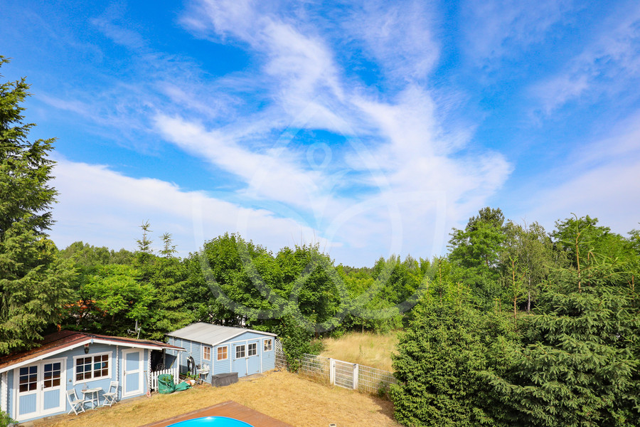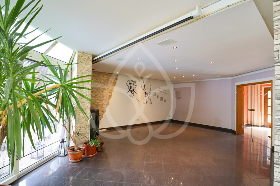 Im Erdgeschoss befinden sich ein Hauswirtschaftsraum mit separatem Hauseingang, ein Gäste-WC, eine Küche sowie ein großzügiger Wohnbereich mit Kamin, integriertem Wintergarten und direktem Zugang zur Terrasse. Das Dachgeschoss umfasst eine offene Galerie mit Balkon, zwei weiteren Zimmern sowie ein großzügiges Badezimmer mit Dusche und Eckbadewanne. Die Innenwände im Dachgeschoss sind in Trockenbauweise ausgeführt und ermöglichen eine flexible Raumaufteilung. Im gesamten Haus ist eine Fußbodenheizung installiert. Der Außenbereich verfügt über einen Garten mit Swimmingpool, Whirlpool und zwei Gartenhäusern. Eine Gaszentralheizung sowie eine Photovoltaikanlage – beide im Leasing – gehören zur technischen Ausstattung.